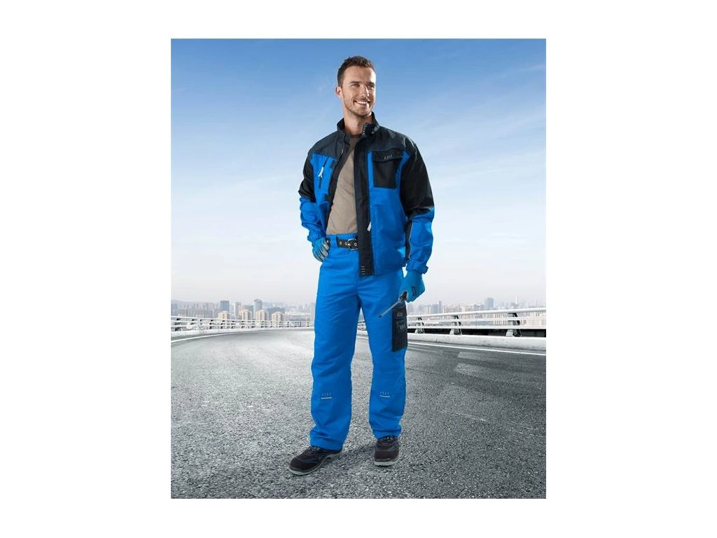 Zajímavě řešená pracovní blůza zkolekce 4TECH vmoderním designu modro-černé nebo šedo-černé barvy sdecentními doplňky vtyrkysové barvě je vyrobena zpohodlné směsi materiálů polyesteru a bavlny.