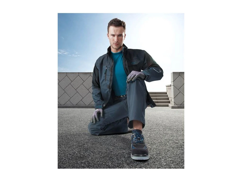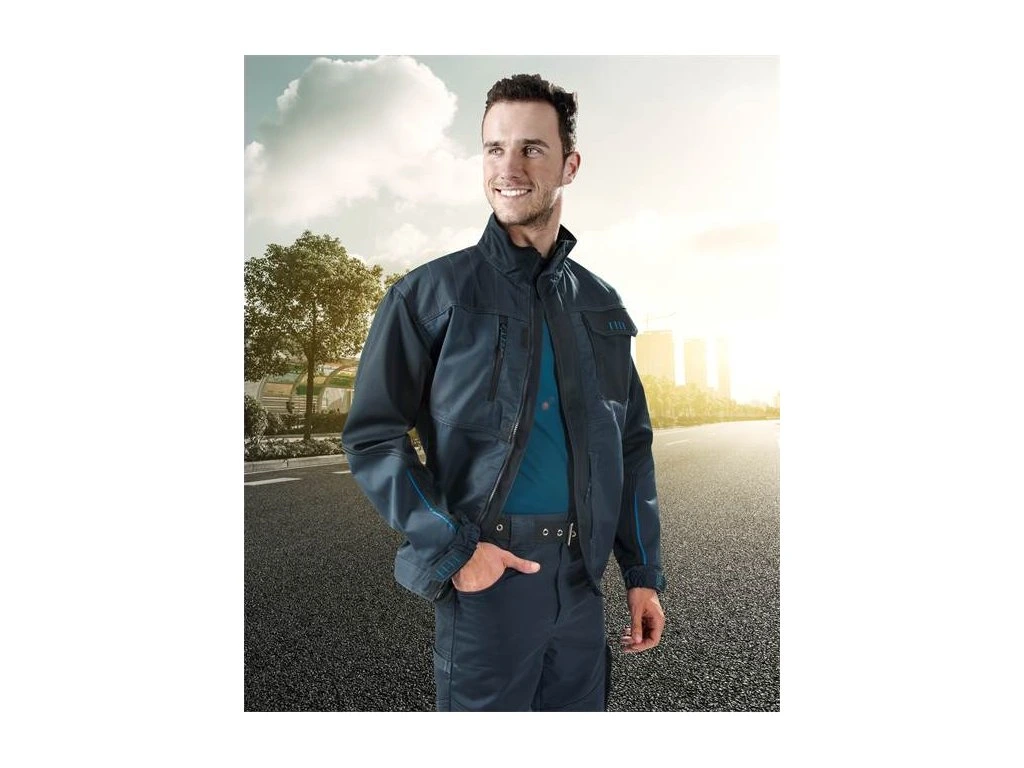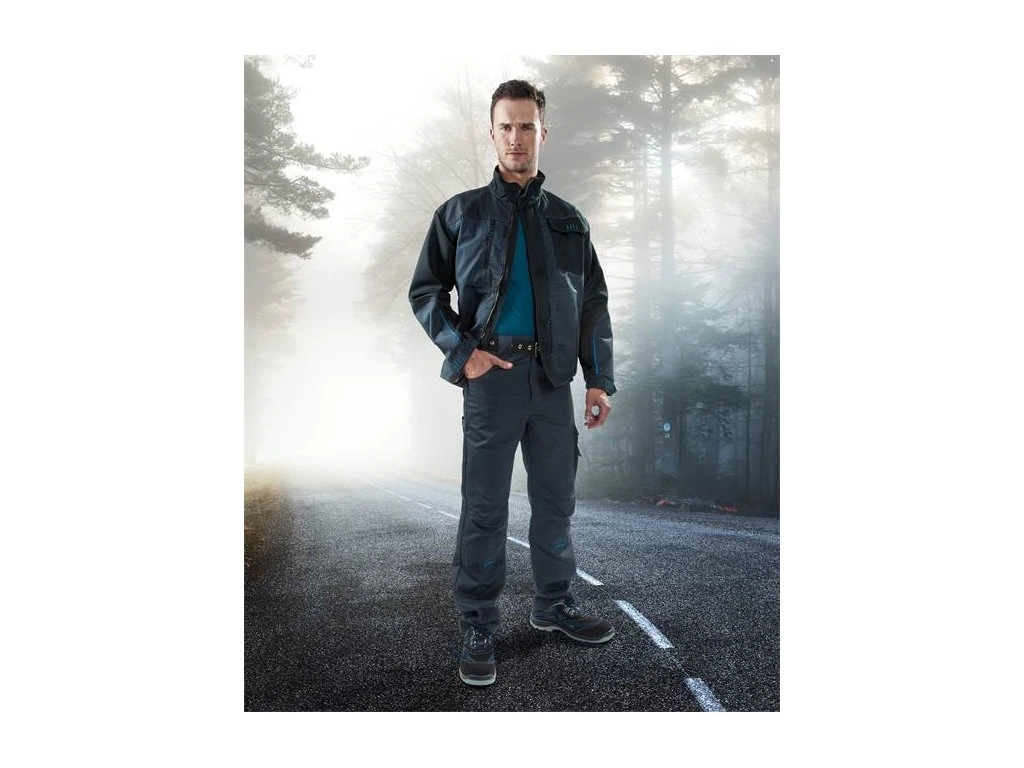 Zajímavě řešená pracovní blůza zkolekce 4TECH vmoderním designu modro-černé nebo šedo-černé barvy sdecentními doplňky vtyrkysové barvě je vyrobena zpohodlné směsi materiálů polyesteru a bavlny.