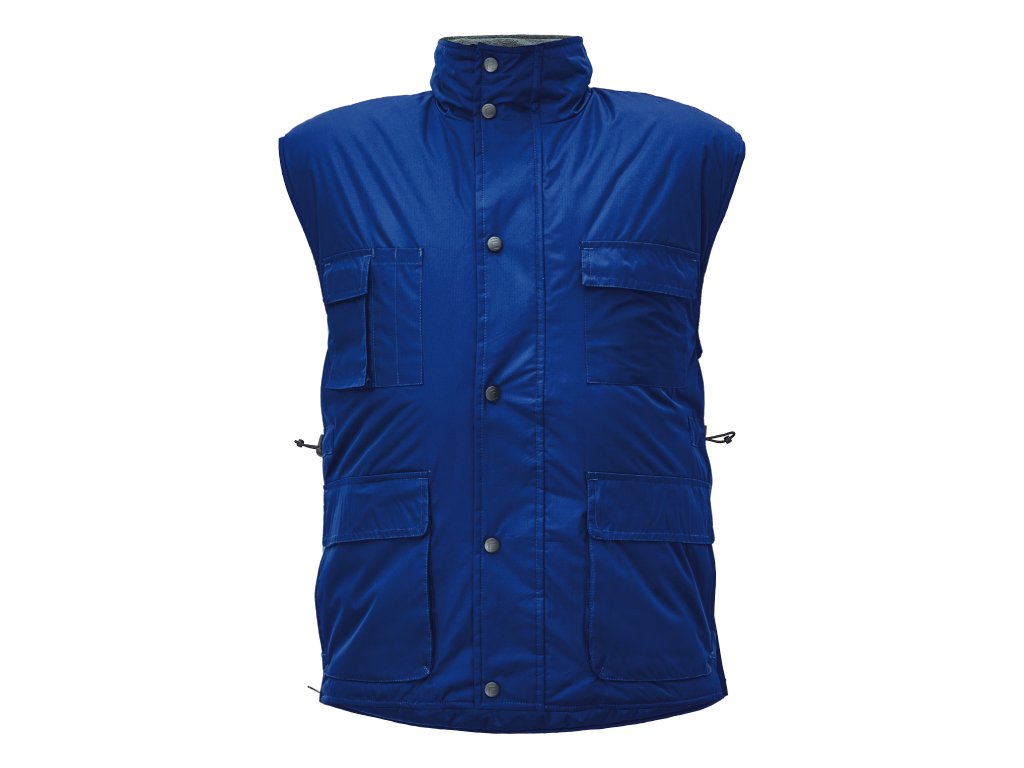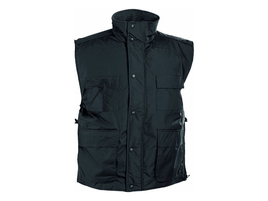 zateplená nepromokavá pánská zimní vesta; prodloužený díl na zádech; polyesterový materiál s mechanicky odolnou úpravou RipStop; 2 přední kapsy, 2 náprsní kapsy; spodní lem ke stažení na šňůrku; na bocích je polohování na zip pro regulaci obvodu vesty.