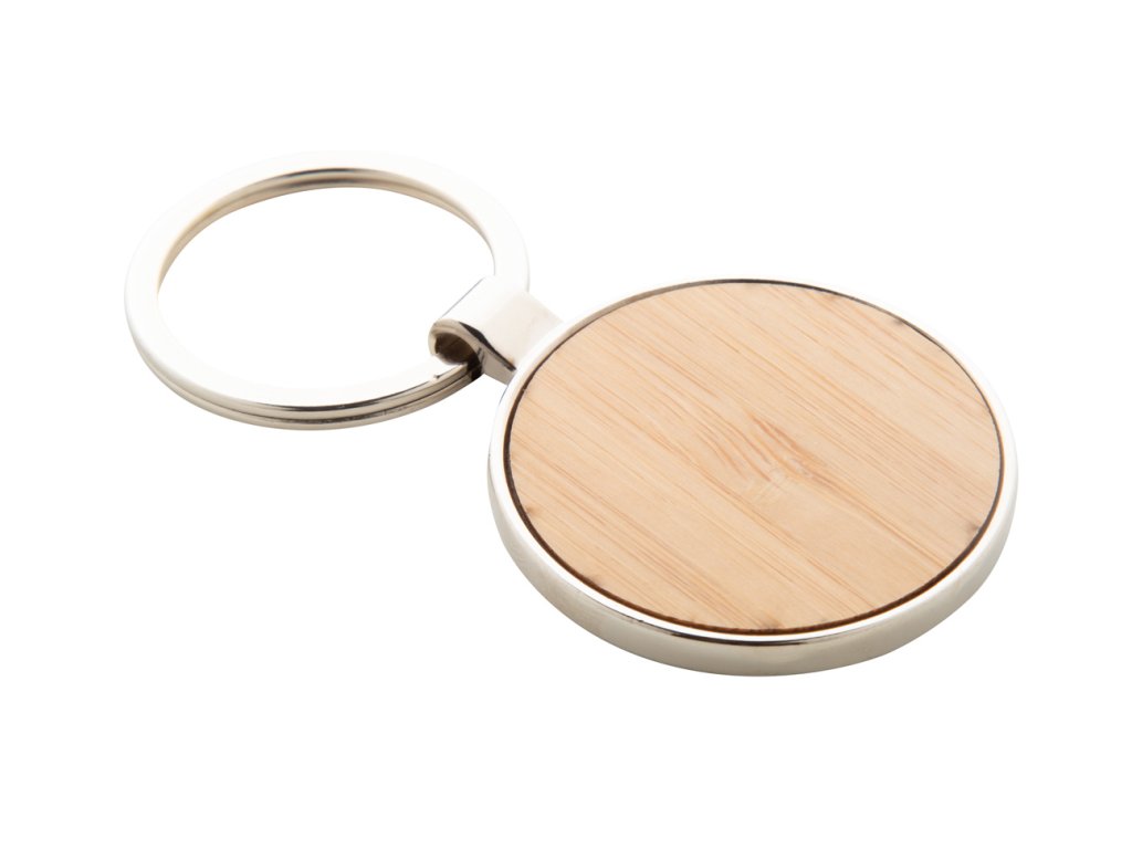 Kovový přívěsek na klíče kulatého tvaru s bambusovou vložkou. V kraftové papírové krabičce. ...