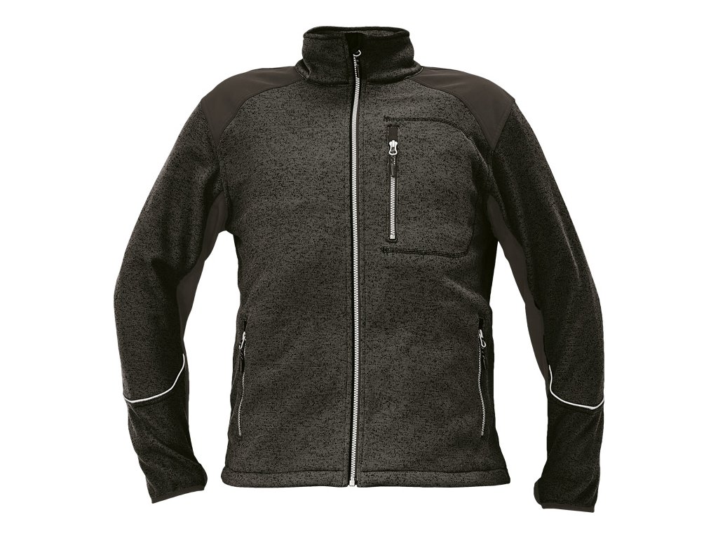 bunda z melírovaného úpletu se zapínáním na zip • zesílená část v oblasti ramen a rukávů softshellovým materiálem • 2 přední kapsy na zip • 1 náprsní kapsa na zip • nastavitelná šíře spodního lemu • očko na palec na konci rukávu
