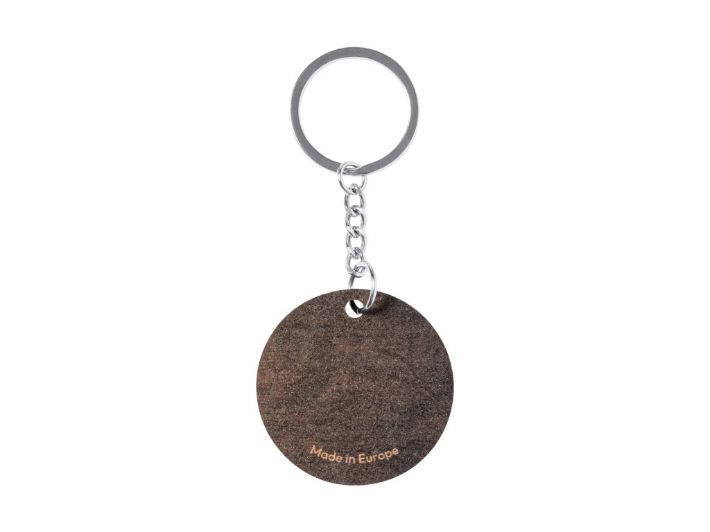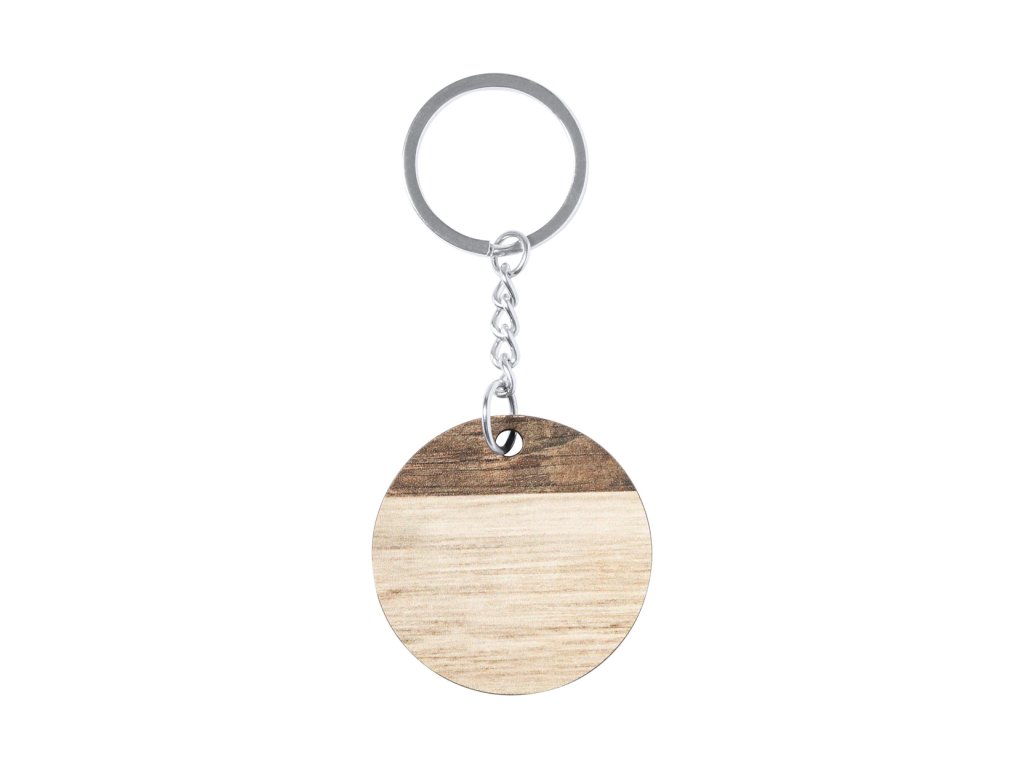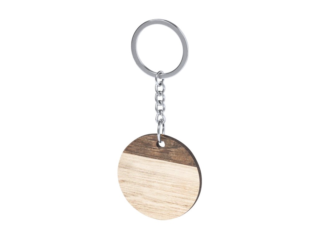Dřevěný kulatý přívěšek na klíče s kovovým kroužkem a dvoubarevným povrchem. ...