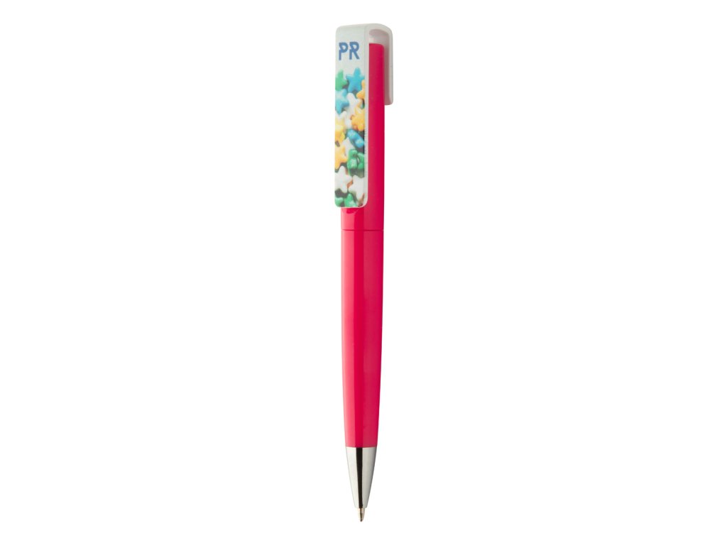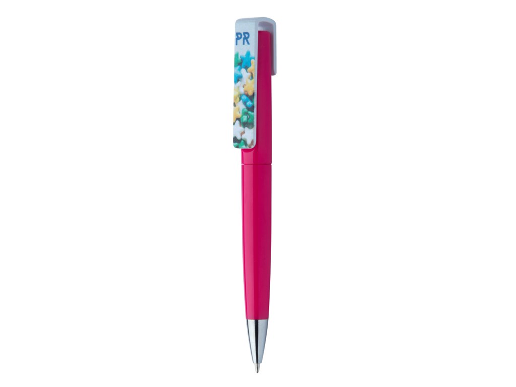 Plastové kuličkové pero s otočným mechanismem a velkým klipem pro potisk, s modrou náplní.