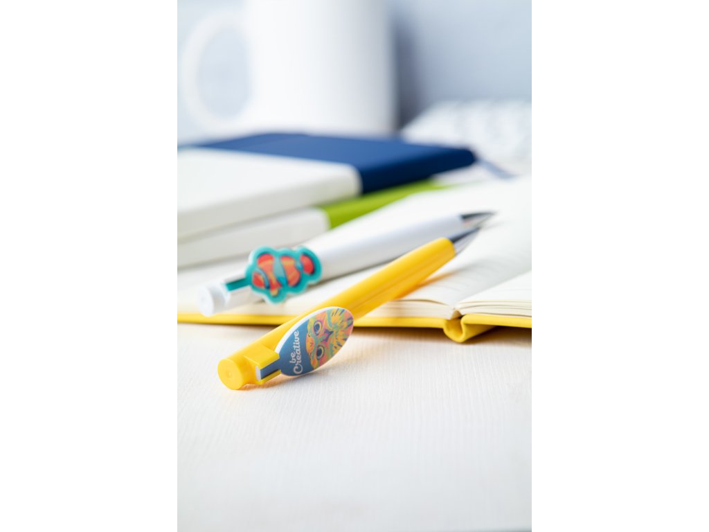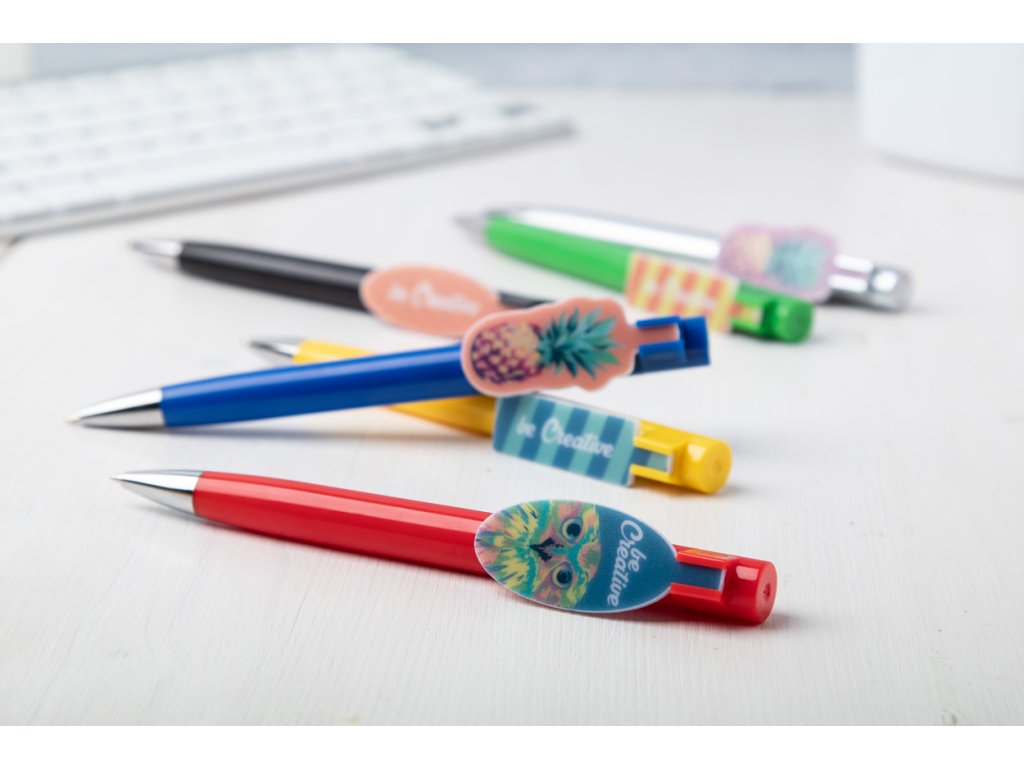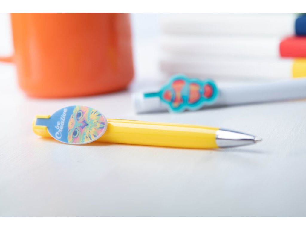 Plastové kuličkové pero s klipem na zakázku a modrou náplní. Klip je vyrobený ve vašem vlastním tvaru - max. rozměr 25x35 mm. Cena zahrnuje UV LED tisk na klipu, nezahrnuje tiskovou přípravu. Min. mn.: 100 ks.