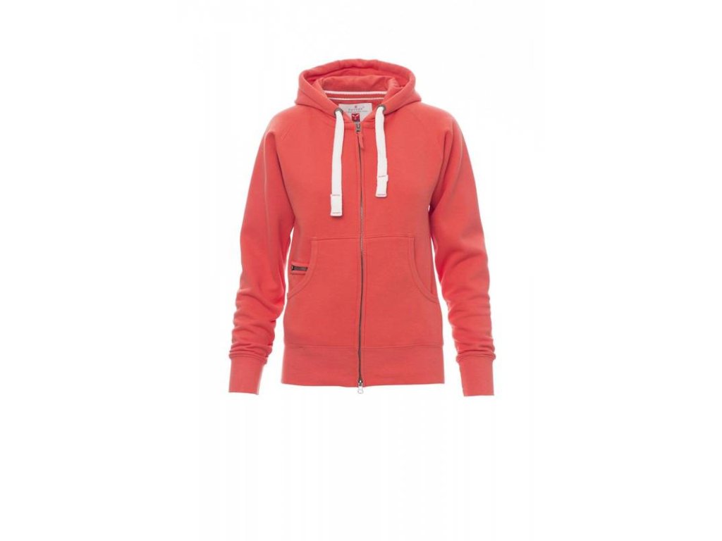 Dámská mikina 300gr. s úplným zipem SBS pokrytým plastem s dvojitým kovovým stahováním, kapuce s dvojitě prošívanými švy a bílou šňůrkou s kontrastním prošíváním a kovovými kroužky, raglánové rukávy, klokaní kapsy, malá kapsa na zip, strečové manžety a lem.