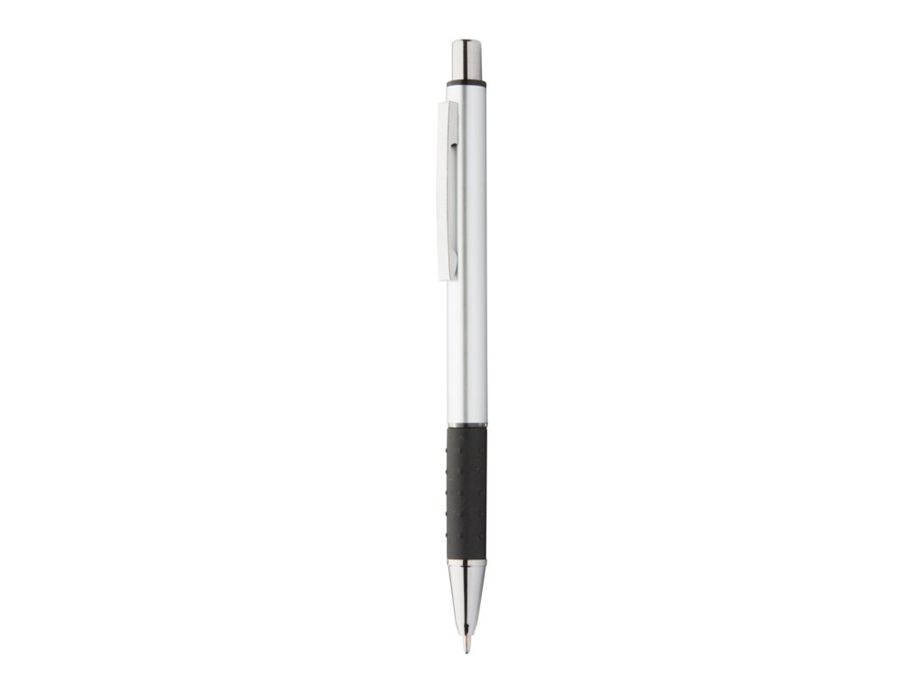 Hliníkové kuličkové pero s gumovým úchopem a modrou náplní.