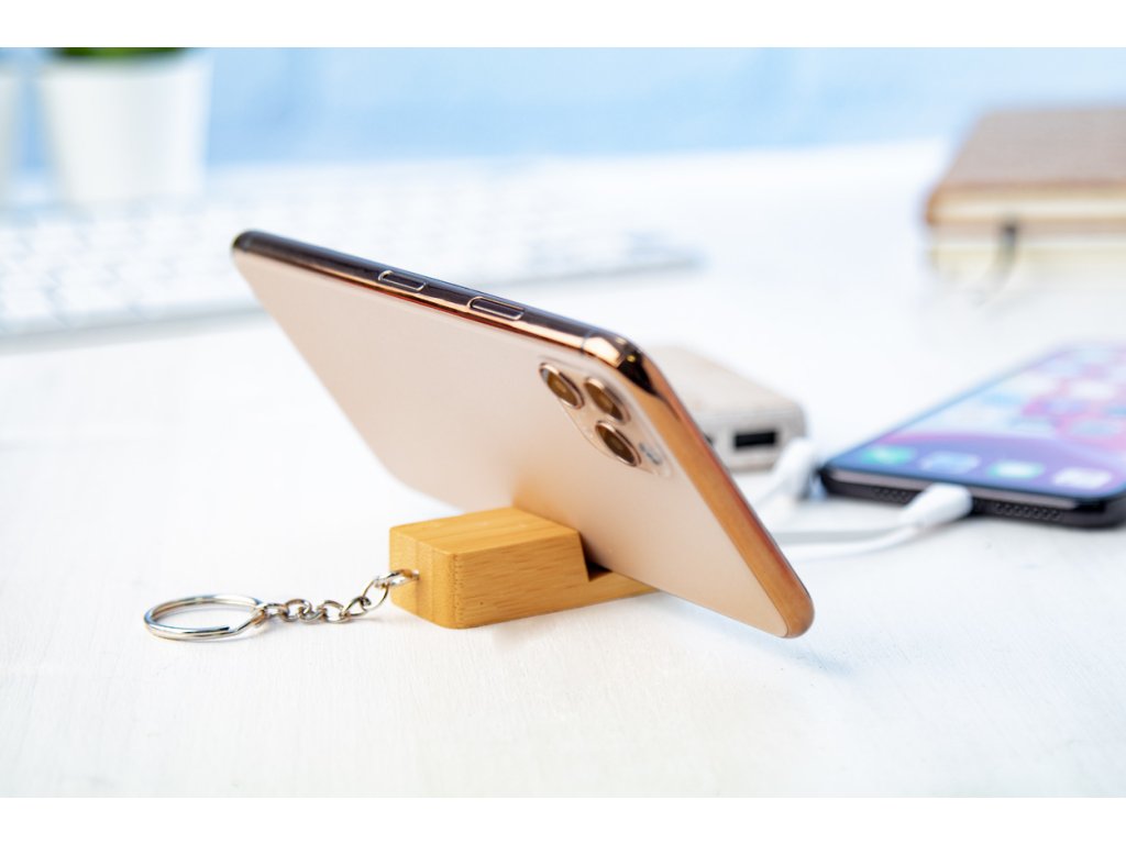 Bambusový přívěsek na klíče na mobil a USB nabíjecí kabel s micro USB, USB-C a Lightning konektory. Se vstupy USB a USB-C. ...