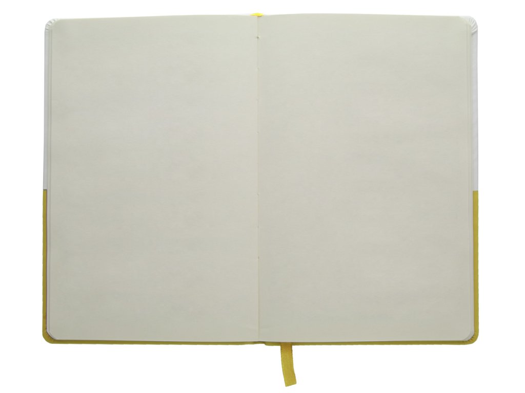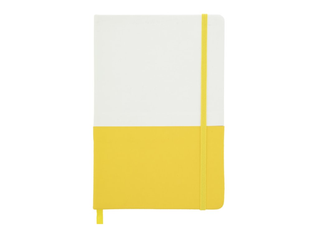 Blok A5 s deskami z PU kůže ve dvoubarevném designu s 80 čistými listy. Stejně barevná gumička a záložka.