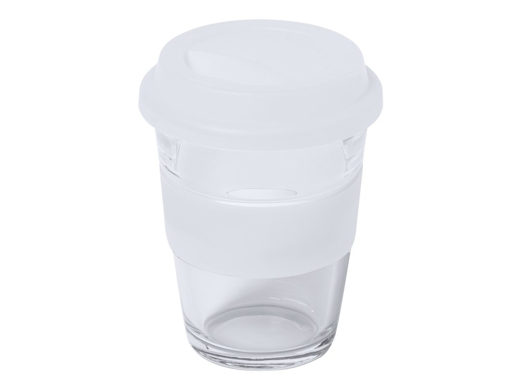 Skleněný jednostěnný cestovní hrnek se silikonovým víčkem a páskem na pití, 350 ml. ...