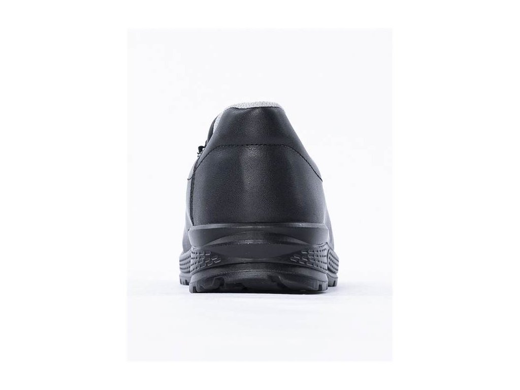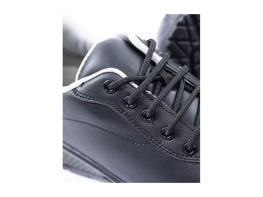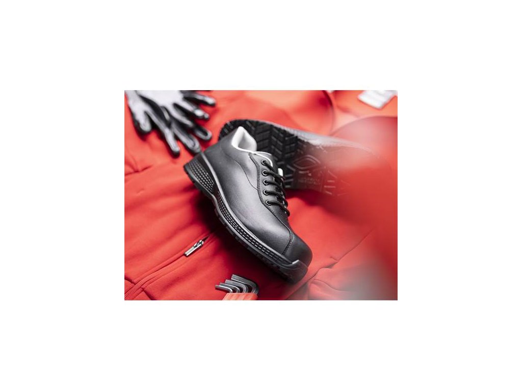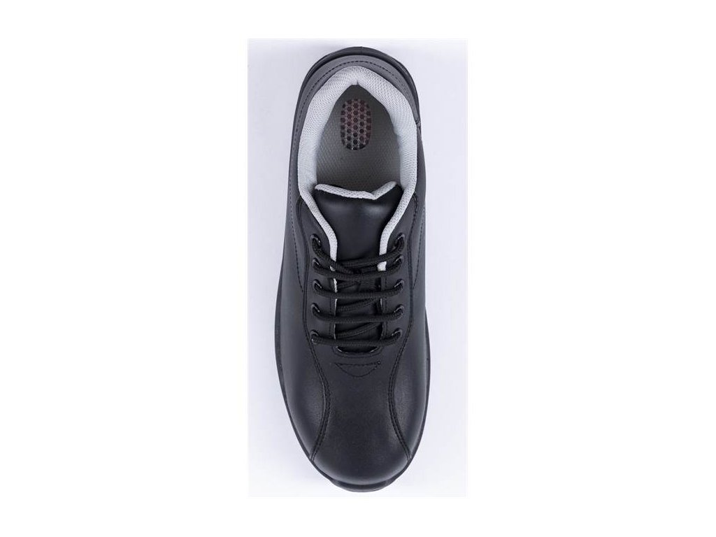 Černá pracovní polobotka, s voděodolnou úpravou svršku, se svrškem z mikrovlákna, díky kterému je pratelná v pračce do 30°C, pro vyšší komfort je obuv vybavena anatomicky tvarovanou stélkou s gelovou složkou, která absorbuje nárazy při chůzi a změkčuje došlap v oblasti paty.