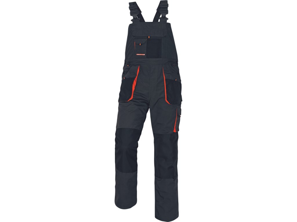 zimní pracovní kalhoty s laclem; vntřní flanelová podšívka; multifunkční kapsy; polyester zesílení Oxford 600D v namáhaných místech a na kolenou s kapsami pro vkládání nákoleníků.