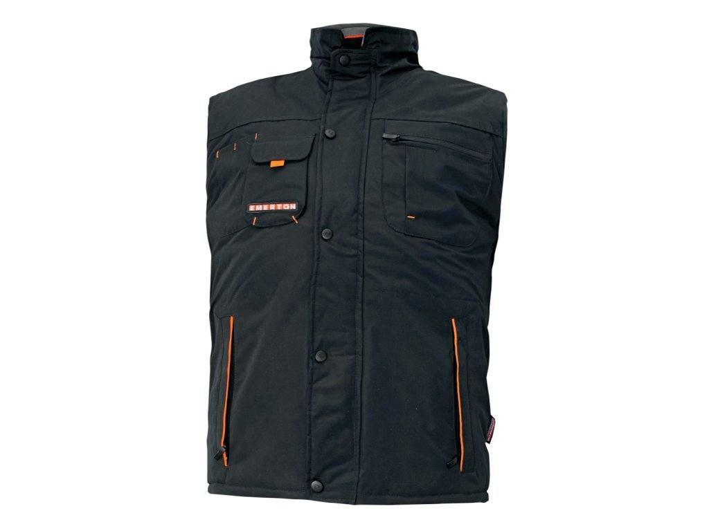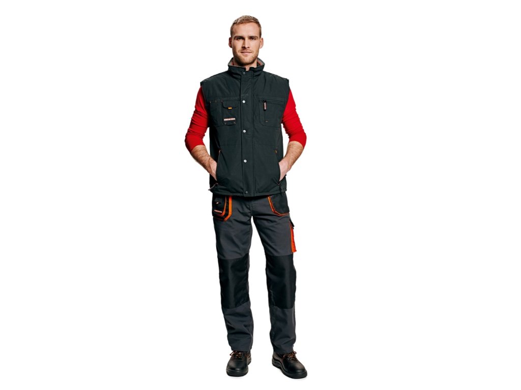 zimní pracovní vesta s fleecovým límcem, zateplení mikrovláknem; zapínání na zip kryté légou; vodě a větru odolná; 2 přední kapsy na zip, 2 náprsní kapsy.