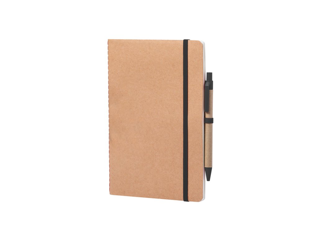 Blok A5 z recyklovaného kartonu s 60 čistými listy a barevnou gumičkou. Včetně plastového kuličkového pera z pšeničné slámy s modrou náplní.