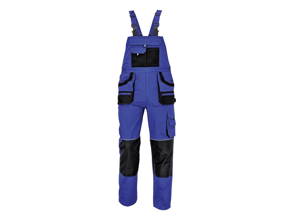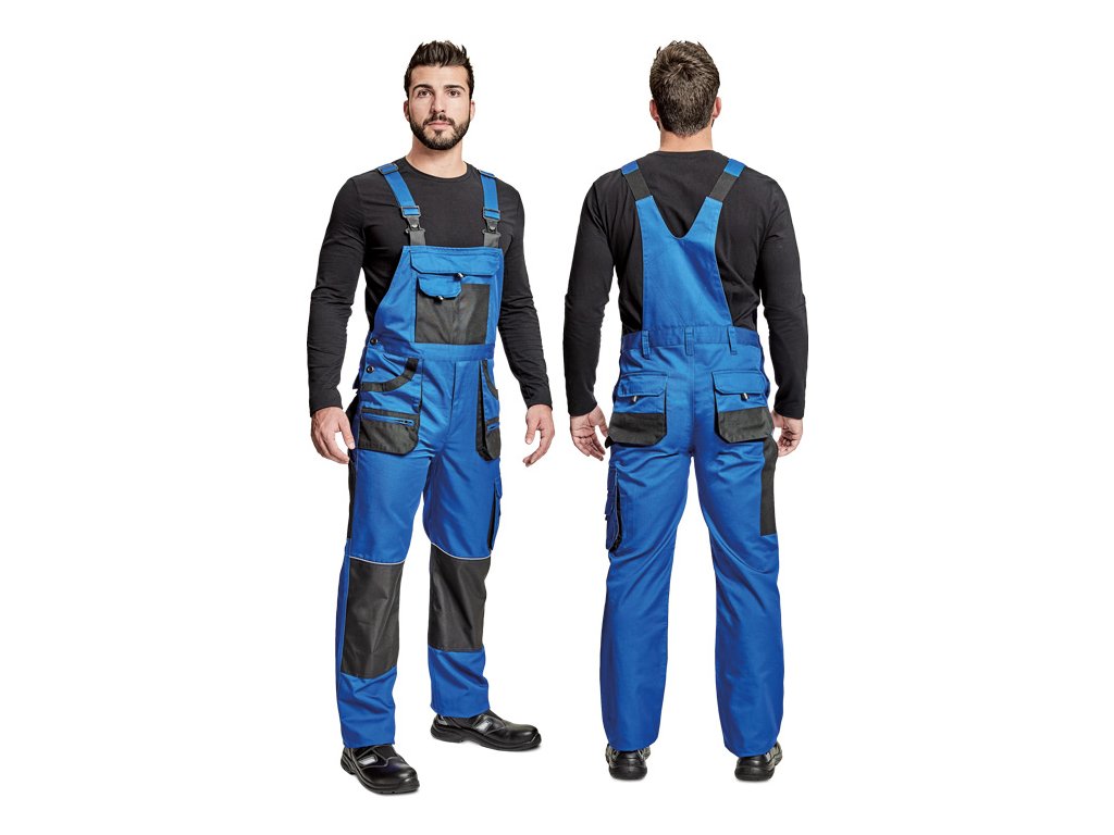 pánské pracovní kalhoty s laclem a multifunkčními kapsami; oboustranné zapínání v pase na knoflíky; polyester Oxford zesílení v kolenních částech s možností vkládání ochranných nákoleníků.