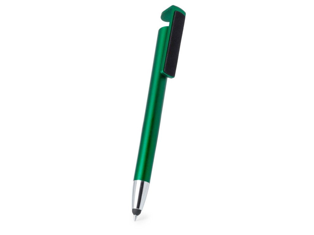Plastové dotykové a kuličkové pero s čistítkem na displeje a funkcí stojánku na mobil, s černou náplní.