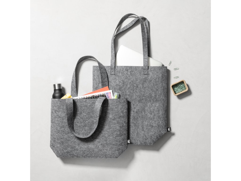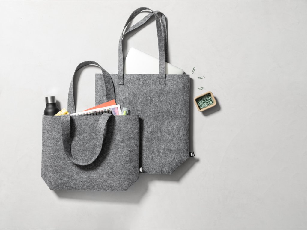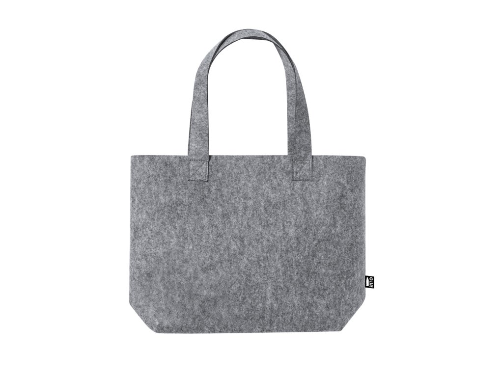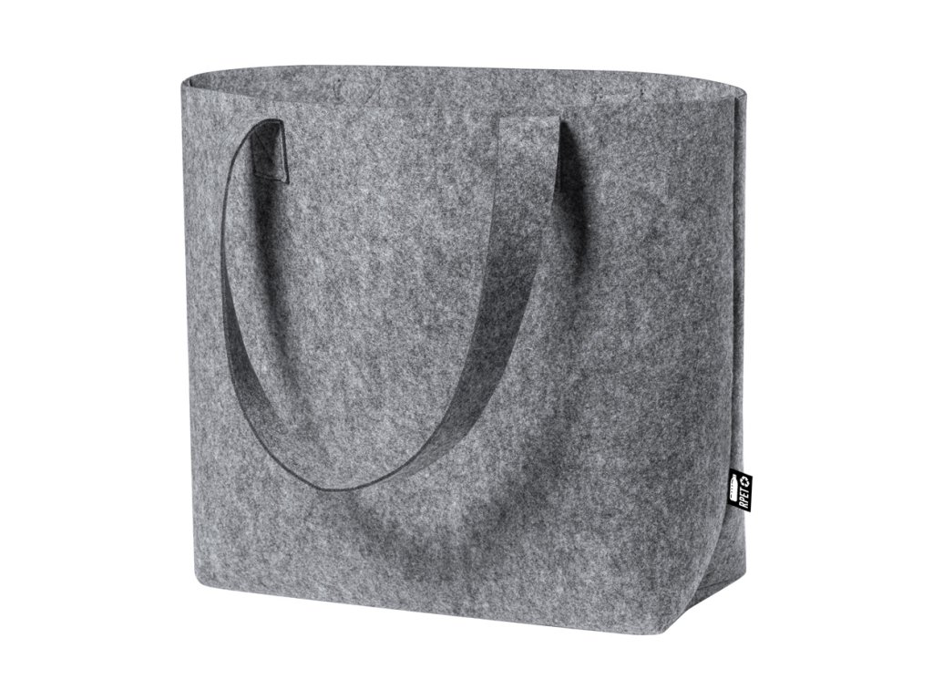 Nákupní taška z RPET filcu s dlouhými uchy a rozšířeným dnem. S výrazným štítkem RPET.