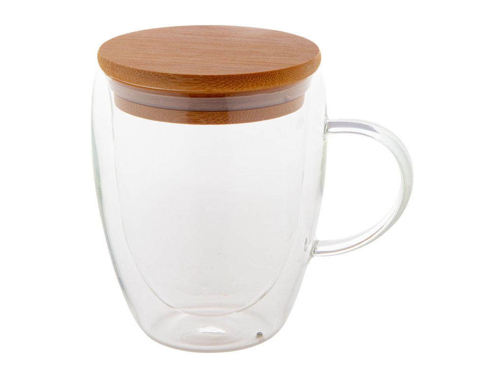 Dvoustěnný termohrnek z borosilikátového skla s uchem a bambusovým víčkem, 350 ml. V kraftové papírové krabici.
