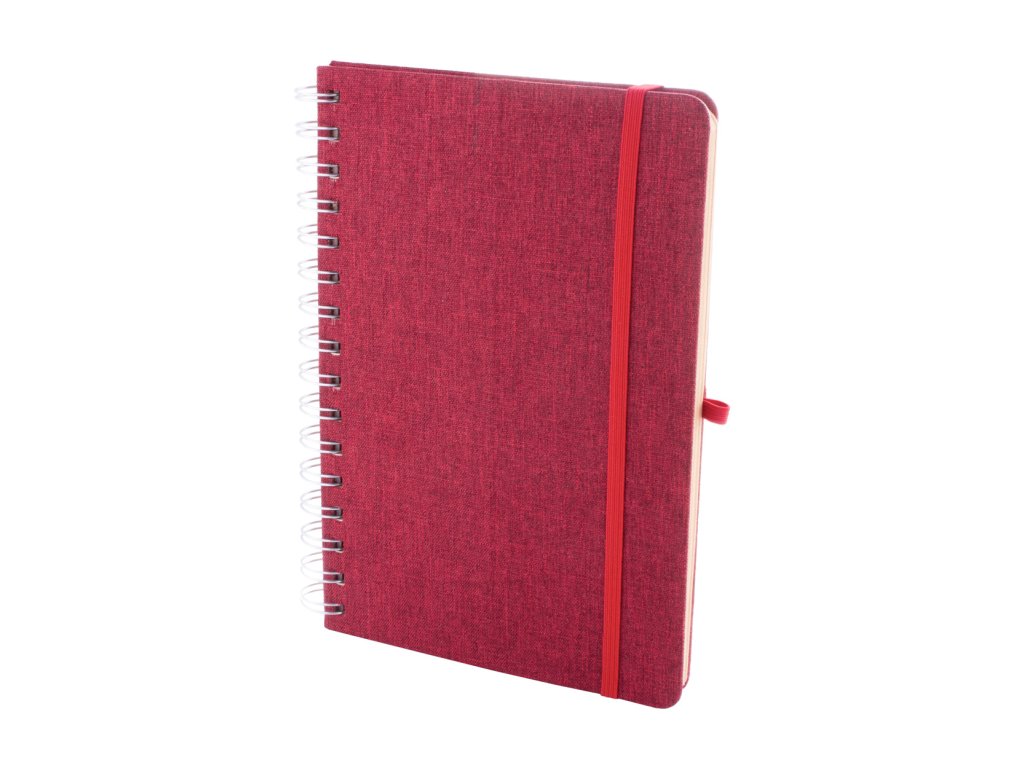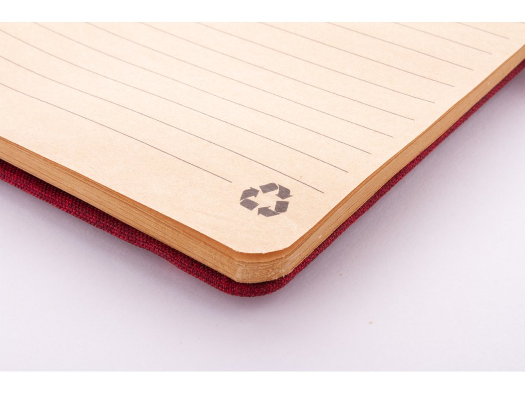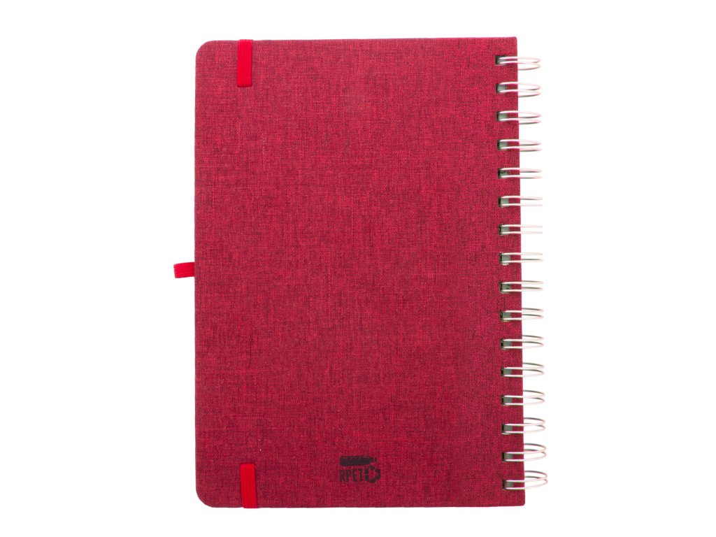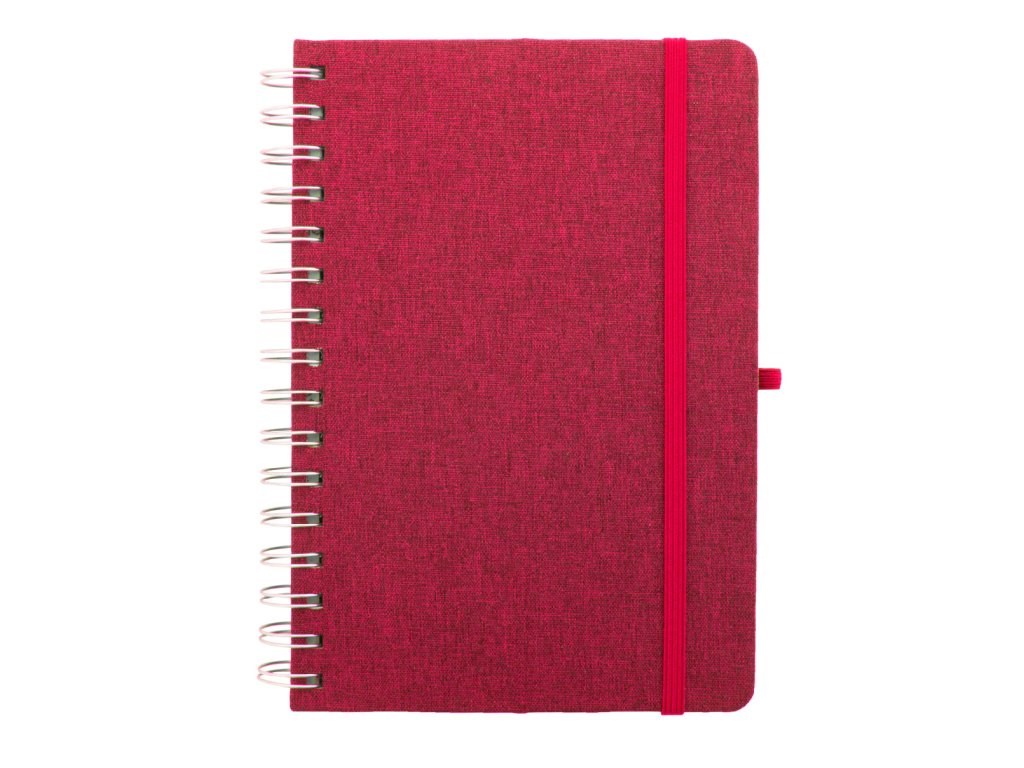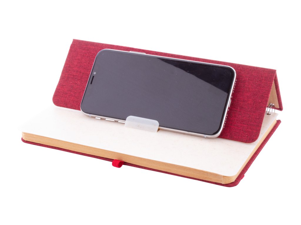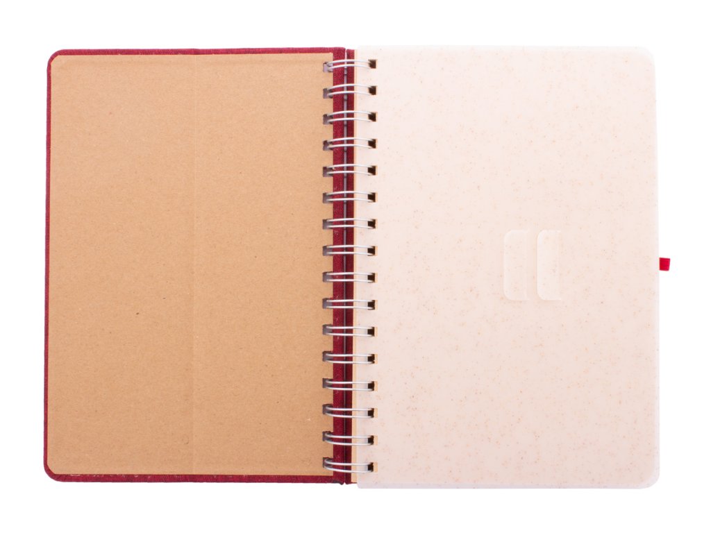 Spirálový nblok A5 s deskami potaženými polyesterem RPET s plastovým držákem na mobil a tablet z pšeničné slámy. Se 70 linkovanými listy z recyklovaného kraftového papíru, gumičkou a držákem na pero. ...