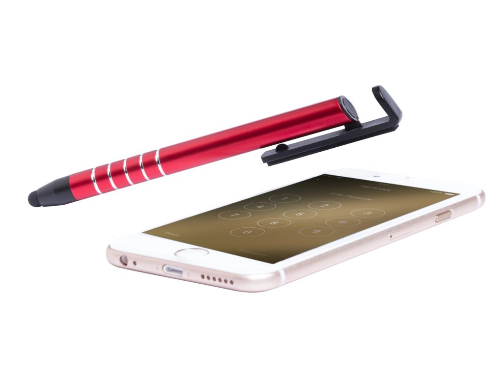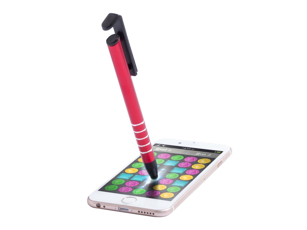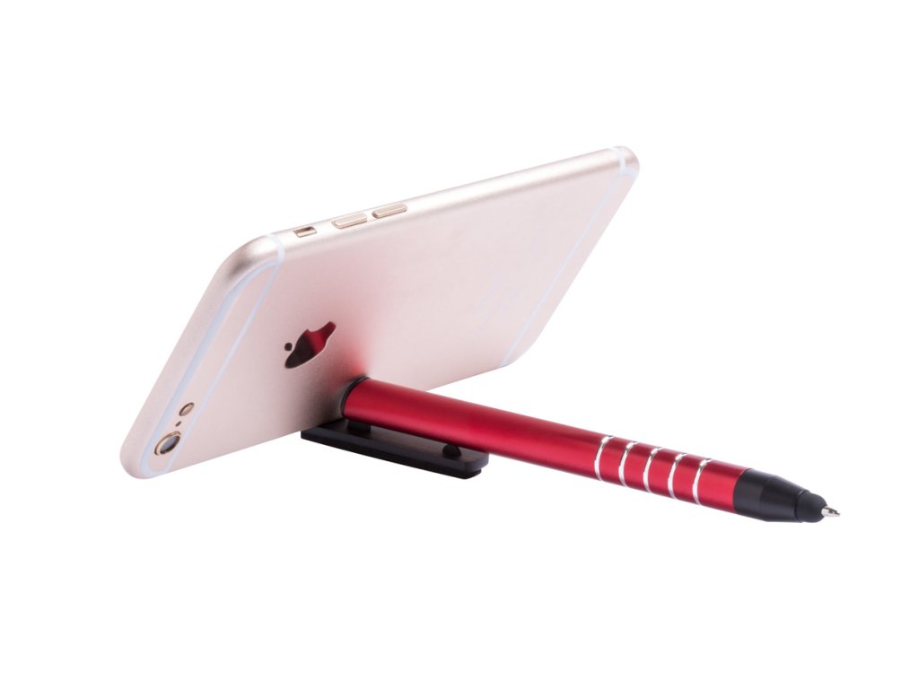 Hliníkové kuličkové a dotykové pero s funkcí stojánku na mobil v klipu a čistítkem displejů. Modrá náplň. ...