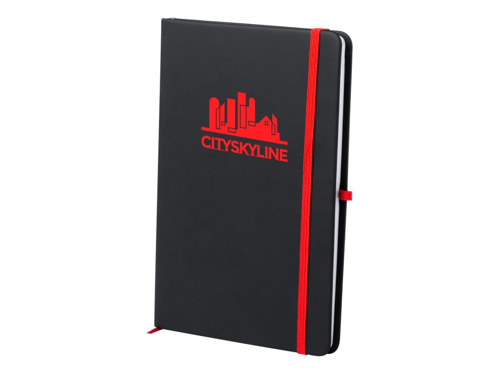 Blok s deskami z PU kůže se 100 linkovanými listy, barevnou záložkou a gumičkou. Se speciální povrchovou úpravou pro laser.