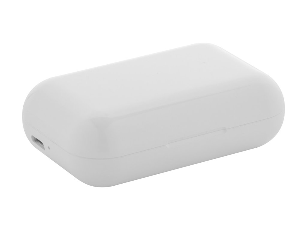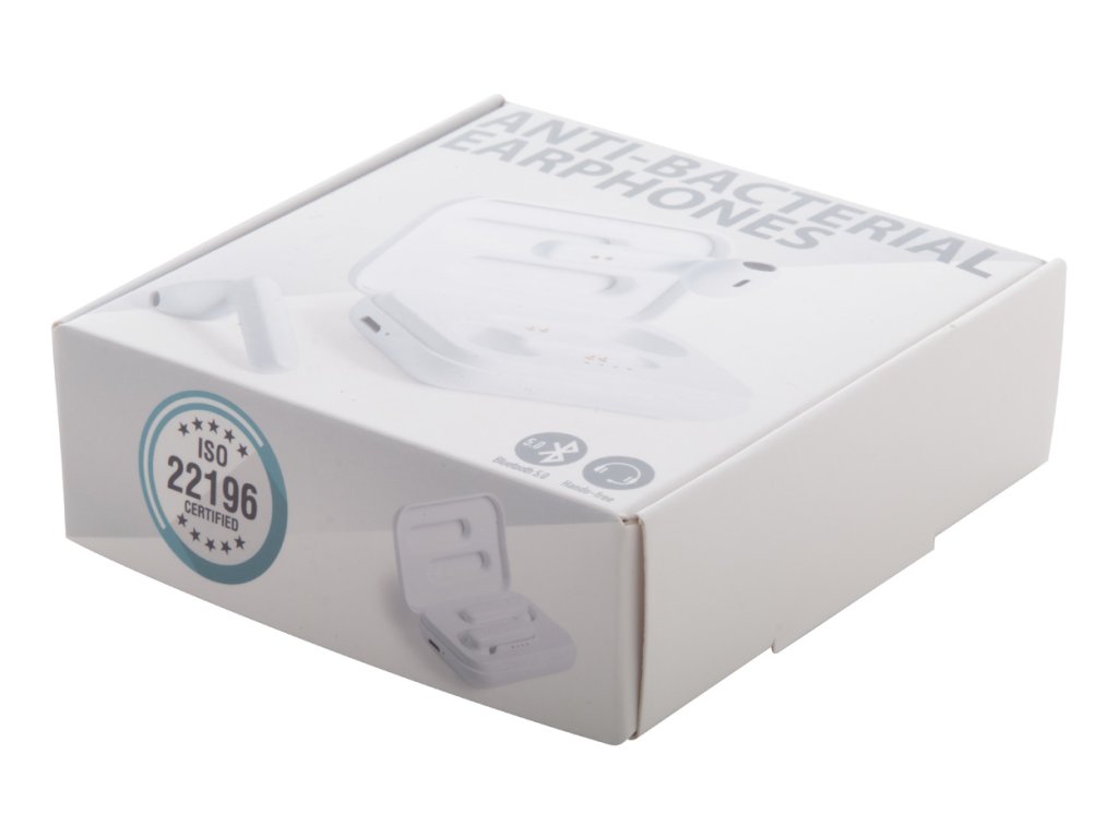 Antibakteriální bezdrátová sluchátka Bluetooth s funkcí hands-free volání v plastové nabíječce. V souladu s ISO 22196. Včetně nabíjecího kabelu USB.