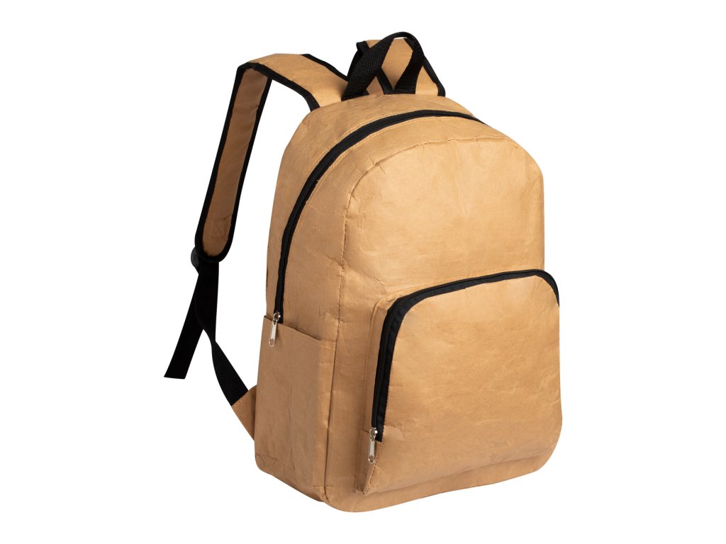 Polaminovaný kraftový papírový batoh s postranními kapsami, přední kapsou na zip a nastavitelnými ramenními popruhy.