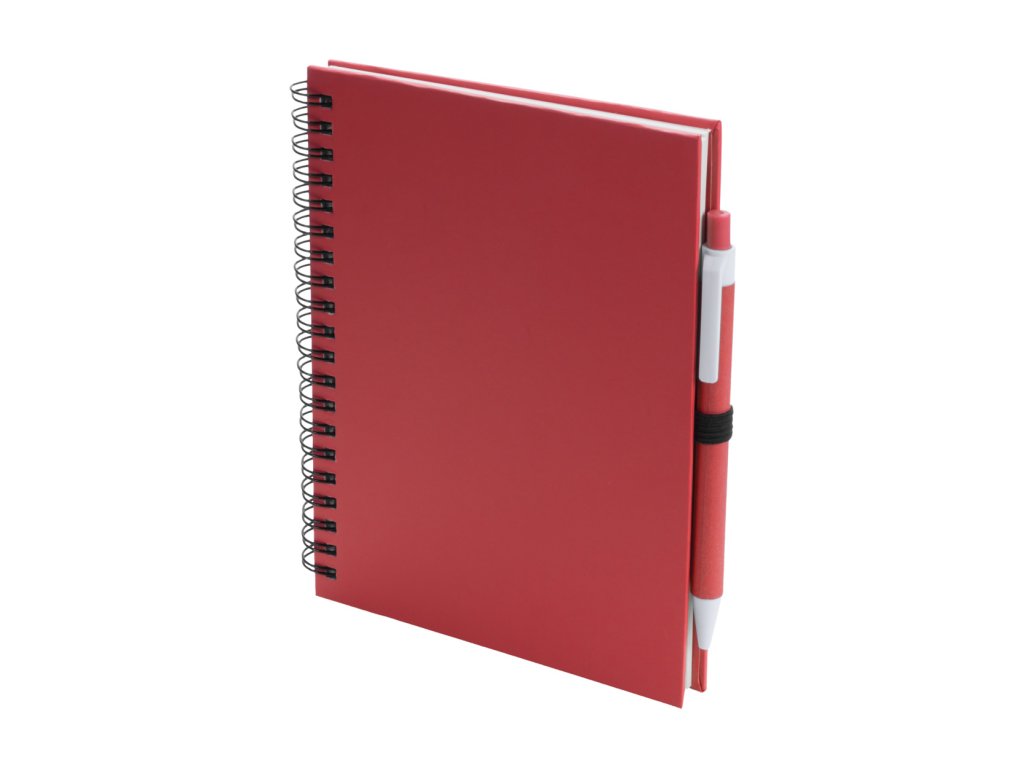 Poznámkový blok se 70 čistými listy a spirálovou vazbou v kartonových deskách, vč. stejně barevného kuličkového pera z recyklovaného papíru s modrou náplní. ...