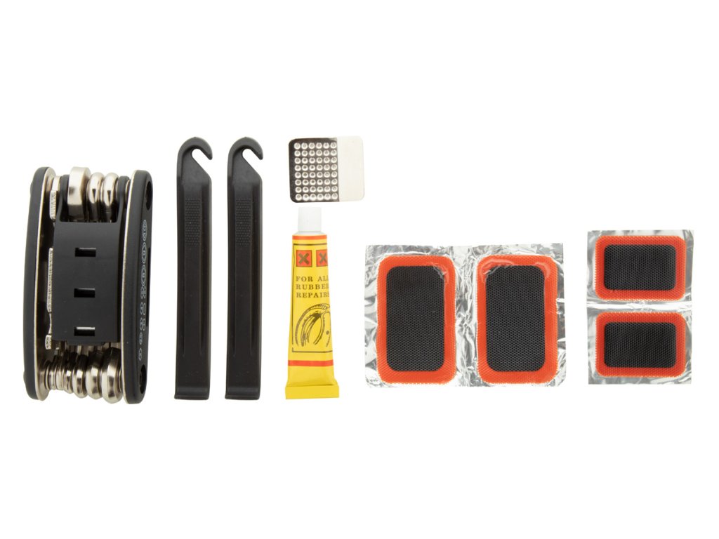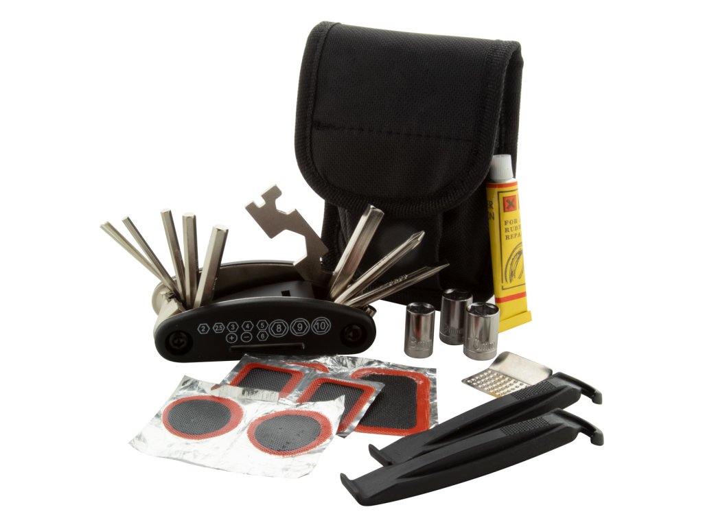 Sada nářadí na opravu jízdního kola v praktickém kufříku. Obsahuje: 15 funkcí multifunkčního nářadí a sady pro opravu defektu (2 páky na gumy, smirkový papír, lepidlo a 6 náplastí).