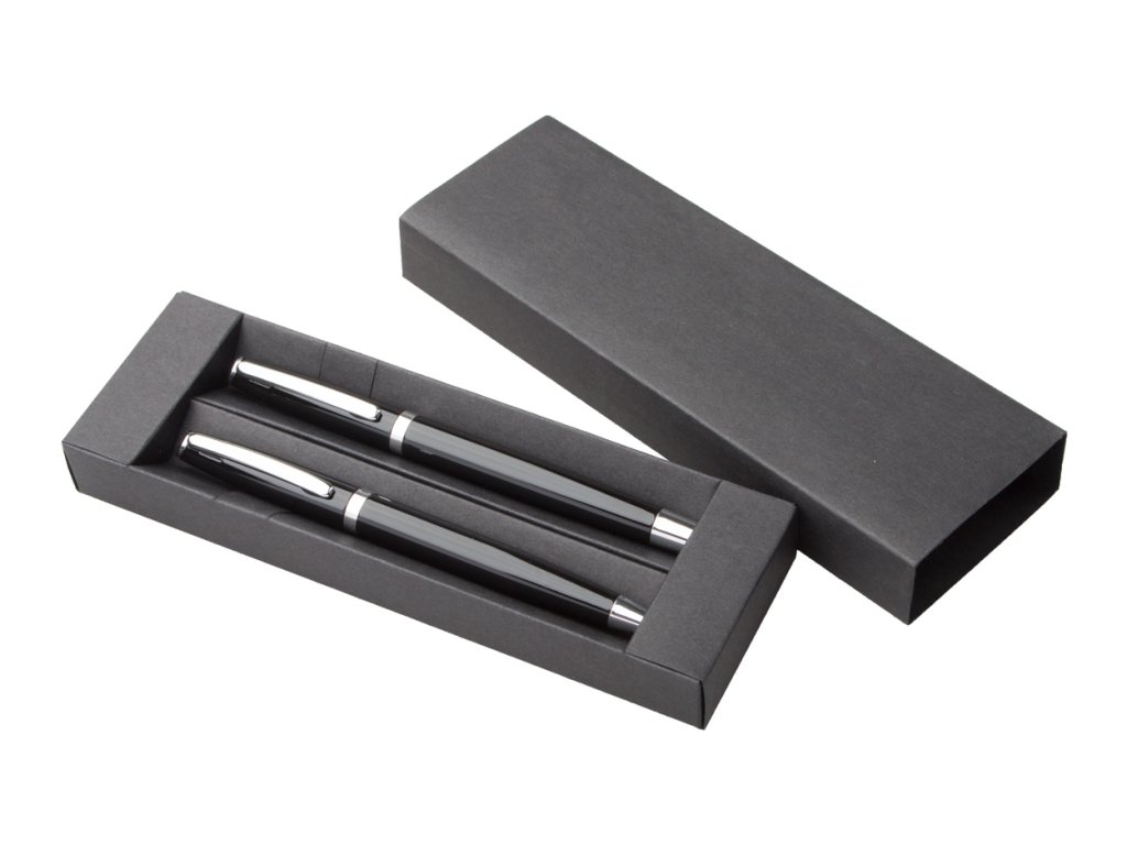 Hliníková sada kuličkového pera a rolleru s modrou náplní v dárkové krabičce.