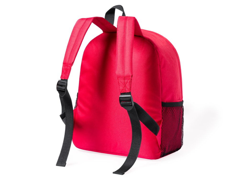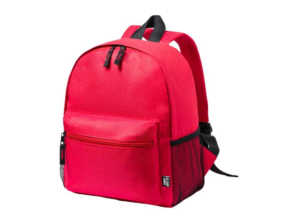 RPET batoh pro děti s přední kapsou na zip, bočními síťovanými kapsami, polstrovanými zády a ramenními popruhy. Polyester 600D RPET, s výrazným štítkem RPET.