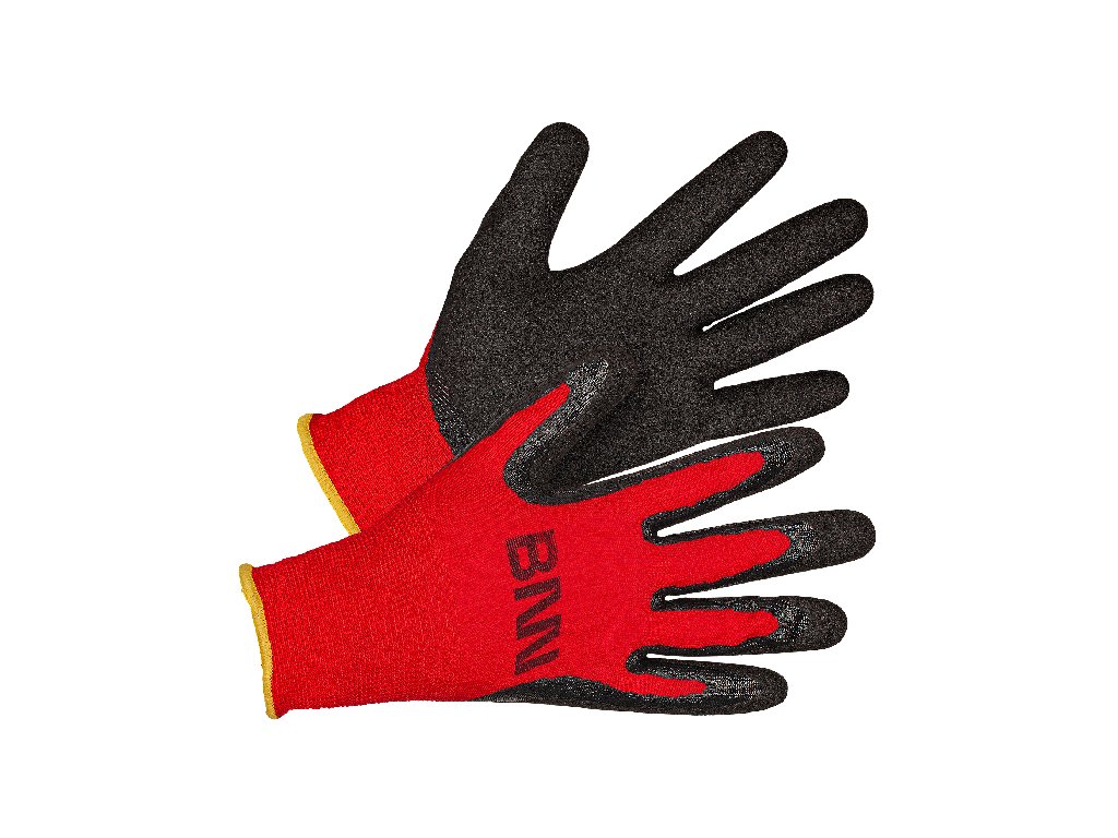 Ochranné bezešvé rukavice Materiál: 100 % PES úplet 13 g, dvouvrstvý nitril – písková úprava, pružná manžeta v zápěstí. Norma: rukavice splňuje základní požadavky na osobní ochranné prostředky dle NAŘÍZENÍ EVROPSKÉHO PARLAMENTU A RADY (EU) 2016/425 ze dne 9. března 2016 o osobních ochranných prostředcích; Jsou vyrobeny v souladu s normou EN 420:2003+A1:2009 a EN 388:2016. Rukavice jsou určeny pro ochranu při mechanickým rizikům; stupeň ochrany 3121X (oděr, prořez, pevnost v trhu a propich) Barva: černá/červená. Využití: logistika, skladování, stavebnictví, hobby, manipulace předměty za sucha i vlhka, automobilový průmysl, montáž a zahrada Velikosti: 7/S–12/2XL