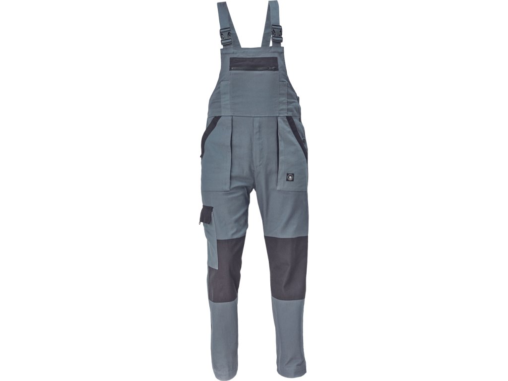 pánské pracovní kalhoty s laclem a elastickým pasem; široké šle s plastovými sponami; 2 přední kapsy, 1 stehenní kapsa; 1 velká náprsní kapsa, 2 zadní kapsy; zesílená oblast kolen; nastavitelná délka nohavic.