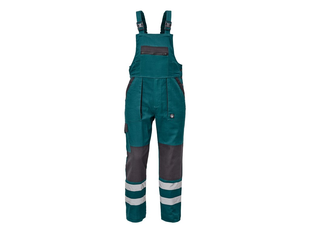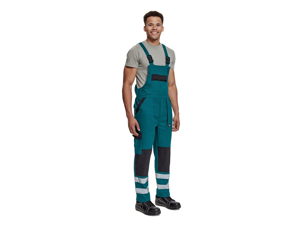 pánské pracovní kalhoty s laclem a elastickým pasem; široké šle s plastovými sponami; 2 přední kapsy, 1 stehenní kapsa; 1 velká náprsní kapsa, 2 zadní kapsy; reflexní pruhy na spodní části nohavic; zesílená oblast kolen.