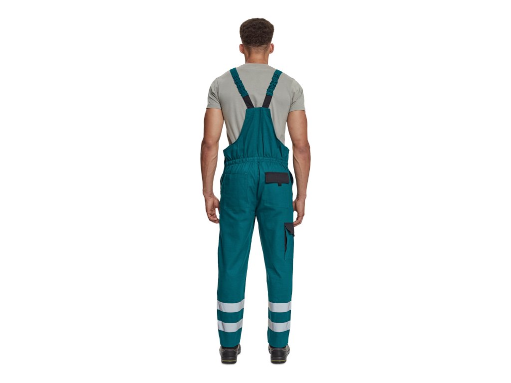 pánské pracovní kalhoty s laclem a elastickým pasem a reflexní pruhy na spodní části nohavic