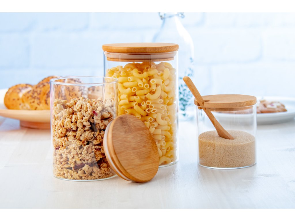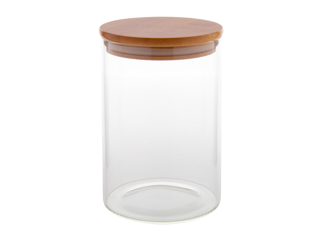 Dóza z borosilikátového skla s bambusovým víčkem, 1000 ml. Ideální pro skladování suchých potravin a přísad.