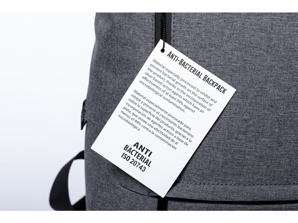 Antibakteriální batoh s polstrovanou přihrádkou na notebook (15 ") a popruhem na vozík. V souladu s normou ISO 20743.
