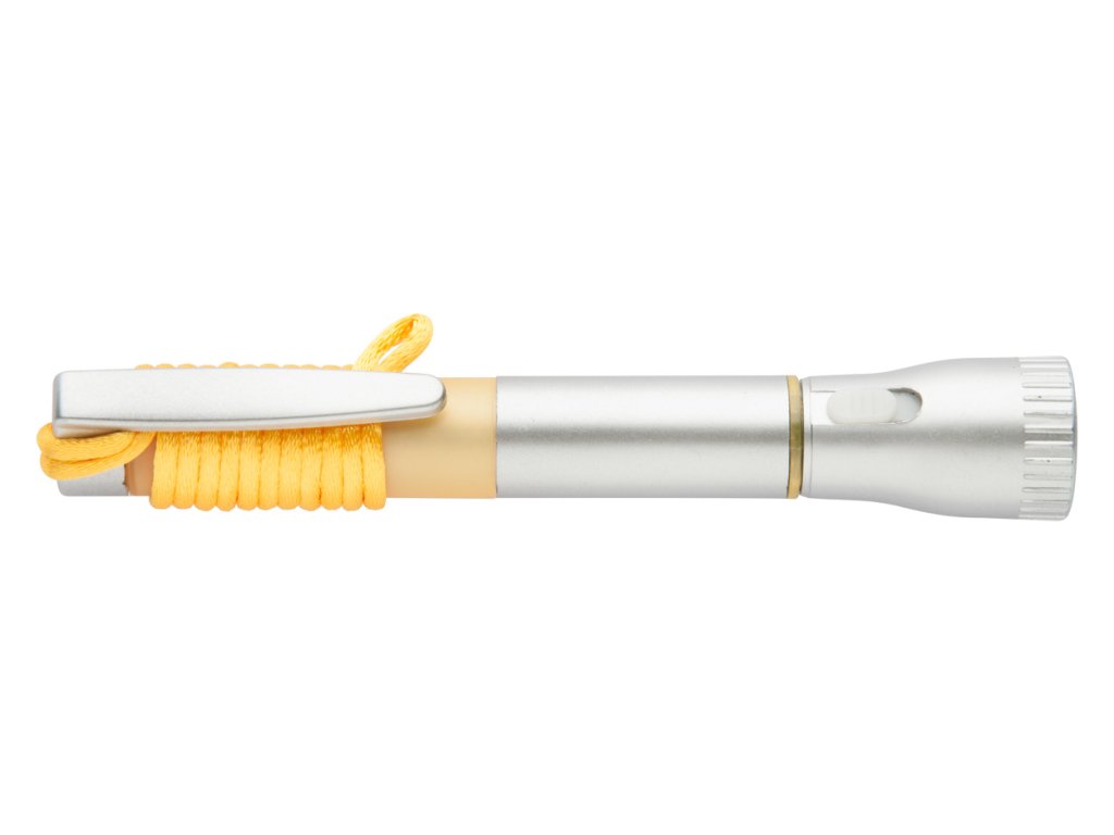 Plastové kuličkové pero s barevnou šňůrkou a 2 LED svítilnou. Dodává se s knoflíkovými bateriemi.