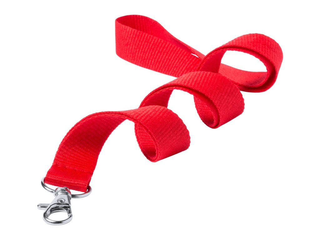 Polyesterový lanyard na krk s kovovou karabinou.