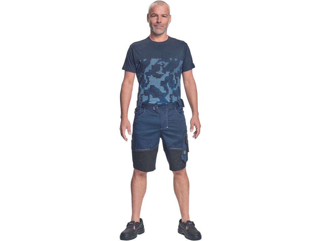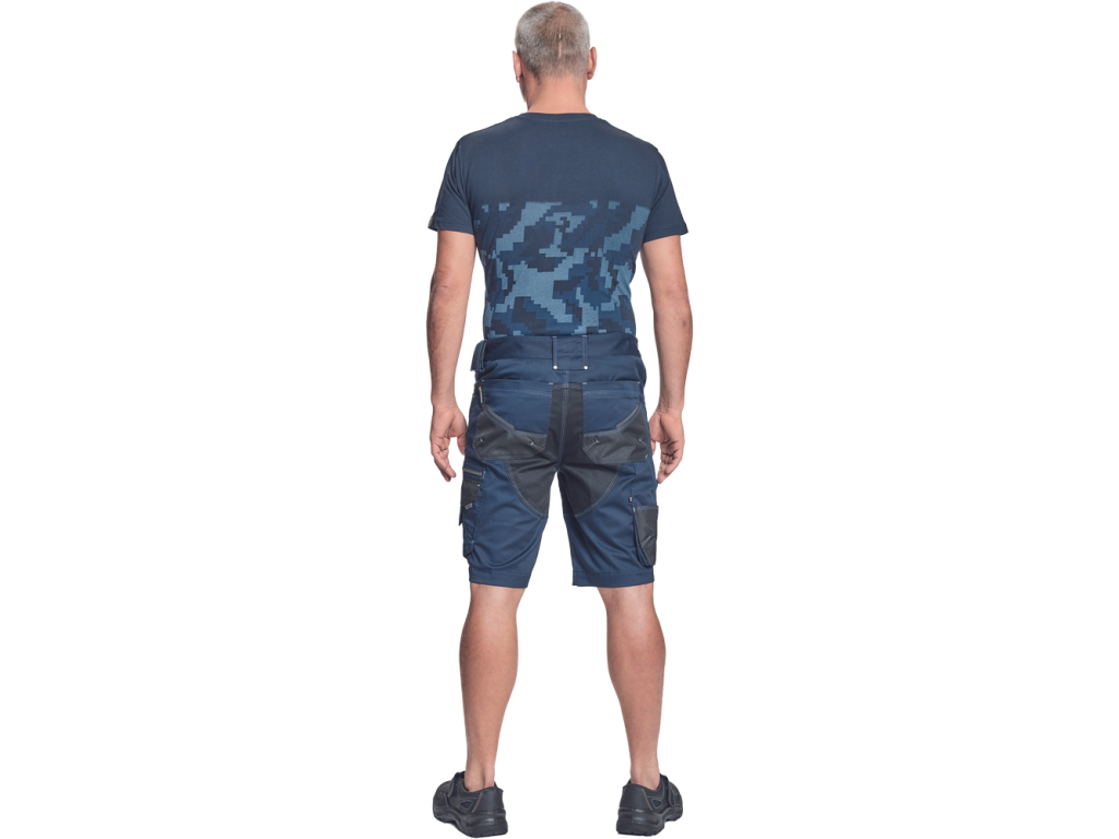 pánské pracovní šortky s pružným pasem; elastický inovativní materiál TRIFIBETEX®; odolné trojité prošití nohavic a sedu; prostorné multifunkční přední kapsy s poutky na nářadí; reflexní prvky v barevném odstínu.