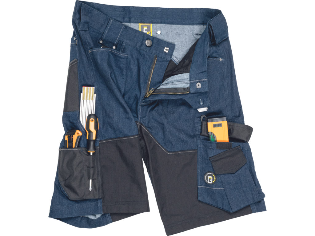 pánské pracovní šortky s pružným pasem; elastická předepraná Denim látka; odolné trojité prošití nohavic a sedu, CORDURA a TRIFIBETEX zesílení v oblasti stehen a sedu; prostorné multifunkční přední kapsy s poutky na nářadí.