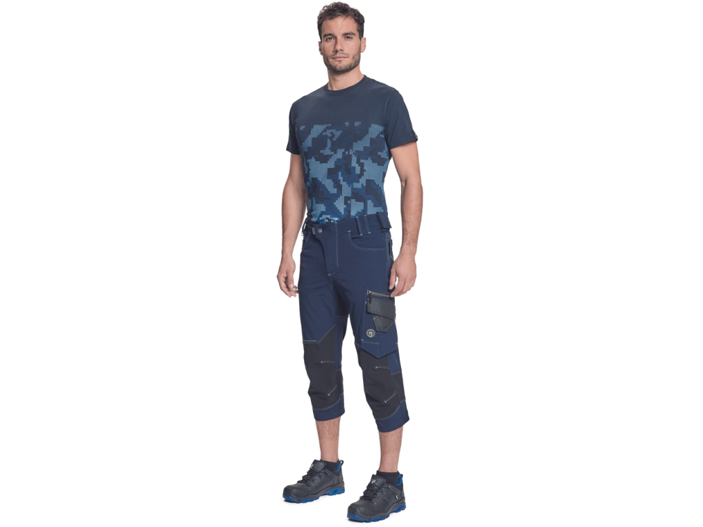 pánské pracovní 3/4 kalhoty s pružným pasem; elastický inovativní materiál TRIFIBETEX PRO®; odolné trojité prošití nohavic a sedu, CORDURA zesílení v oblasti kolen; prostorné multifunkční přední kapsy s poutky na nářadí; reflexní prvky v barevném odstínu.
