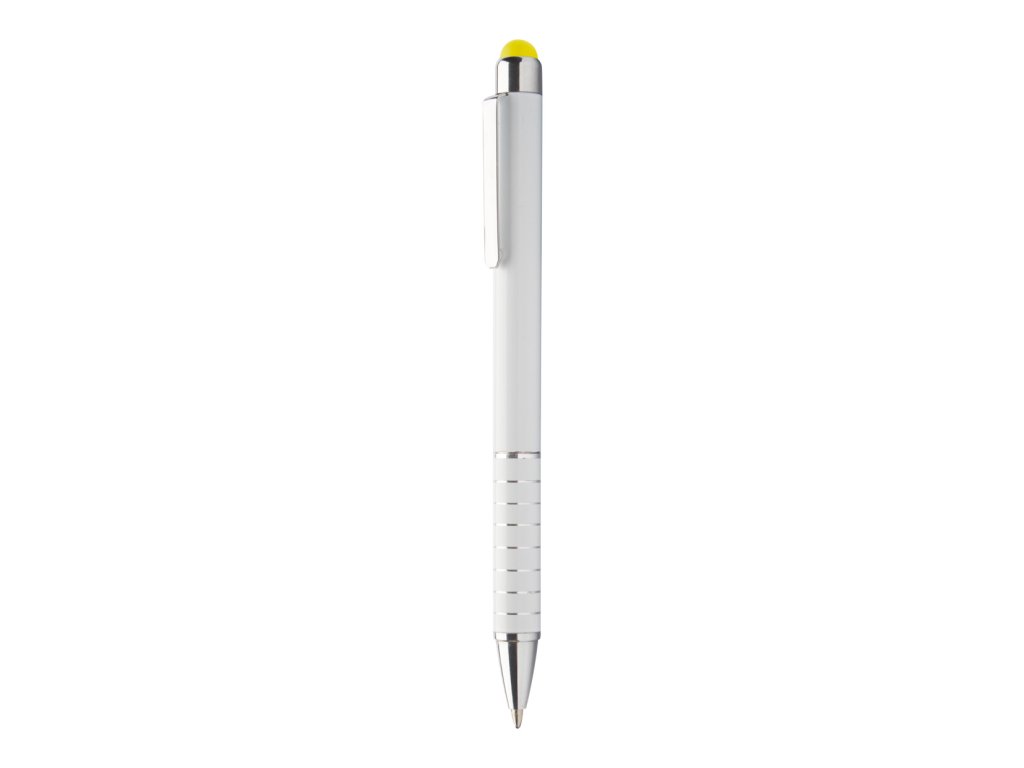 Hliníkové kuličkové a dotykové pero s bílým tělem a barevným dotykovým stylusem, s modrou náplní. ...