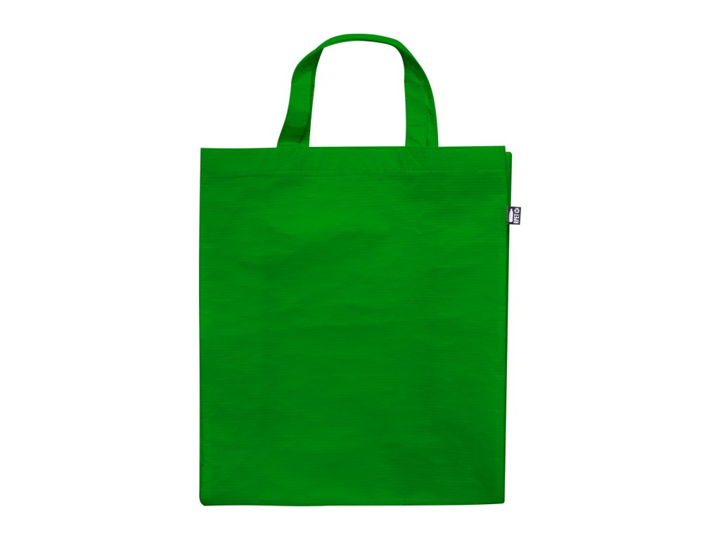 Nákupní taška z polaminovaného polyesteru RPET s klínem a krátkými uchy, 110 g/m². S výrazným štítkem RPET.
