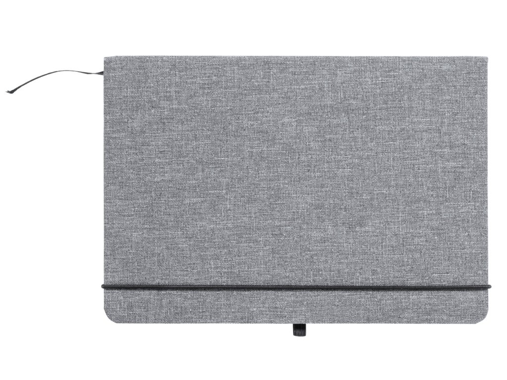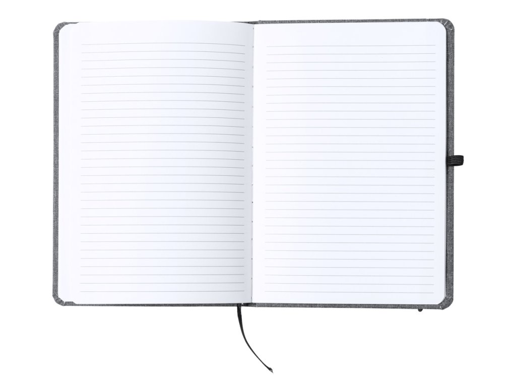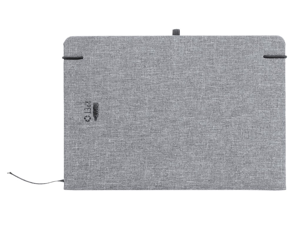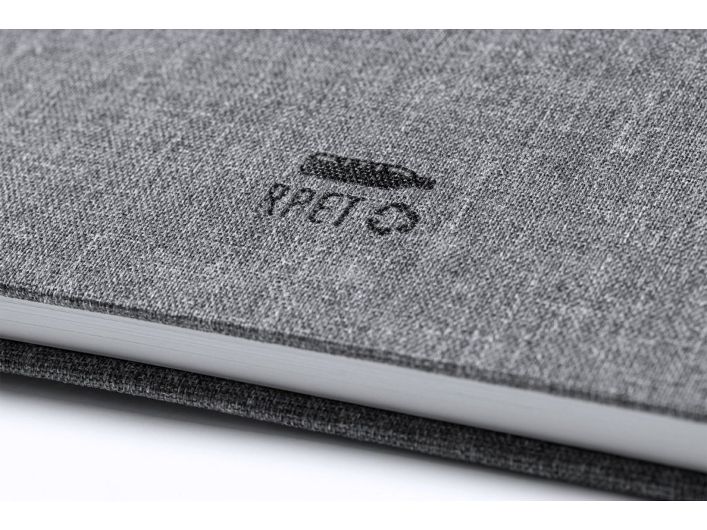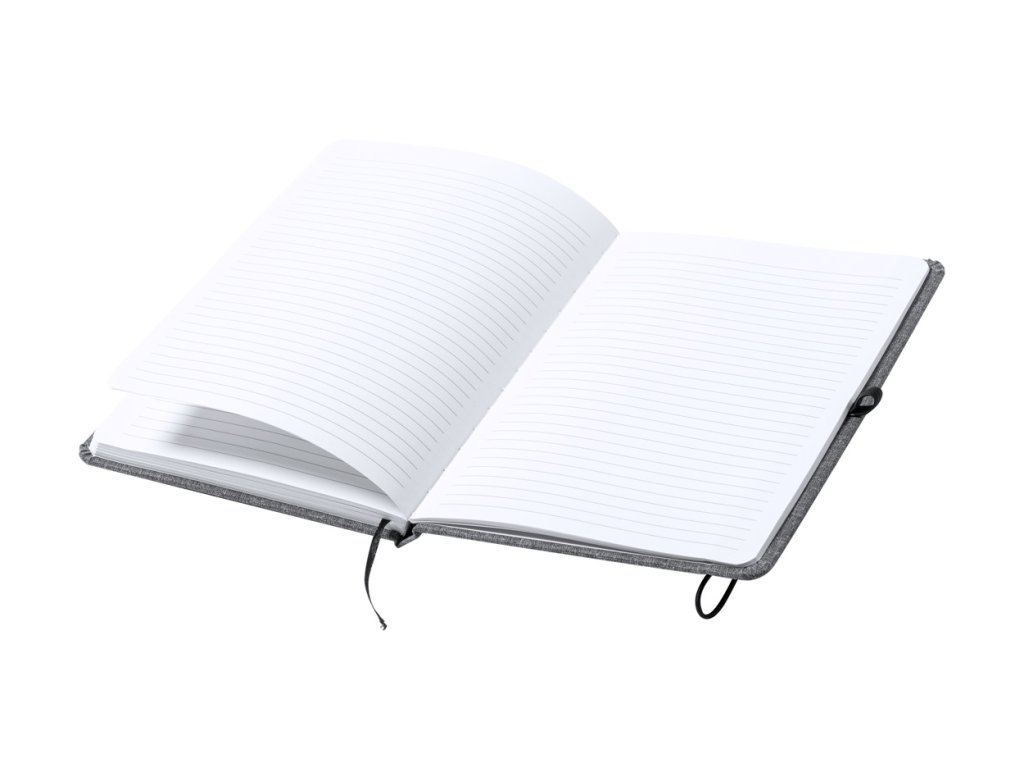 Zápisník potažený polyesterem 600D RPET se 100 linkovanými listy, záložkou a gumičkou. Velikost A5.