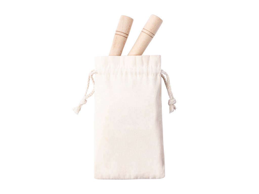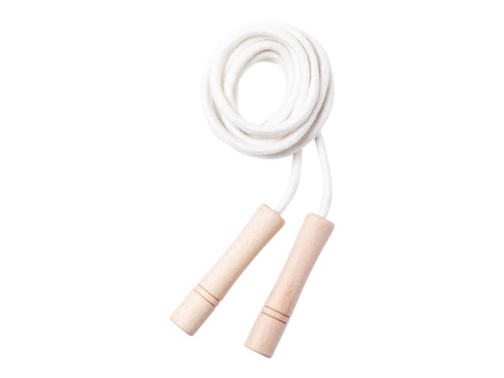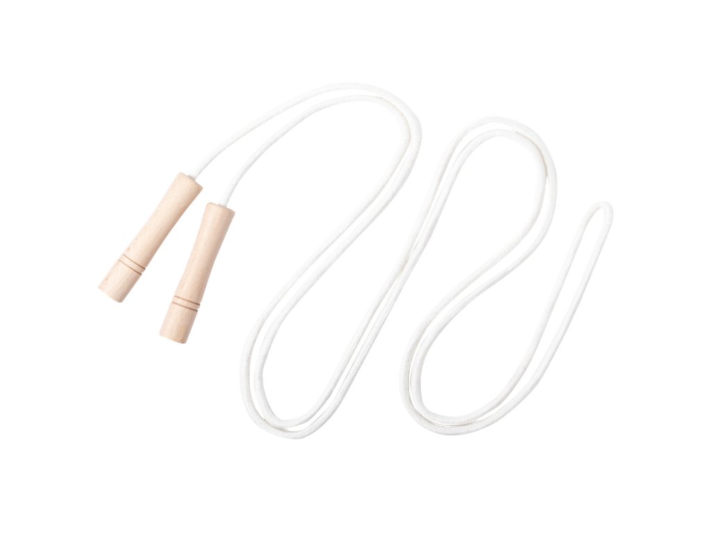 Bavlněné švihadlo s dřevěnými držadly. V bavlněném sáčku se stahovací šňůrkou.