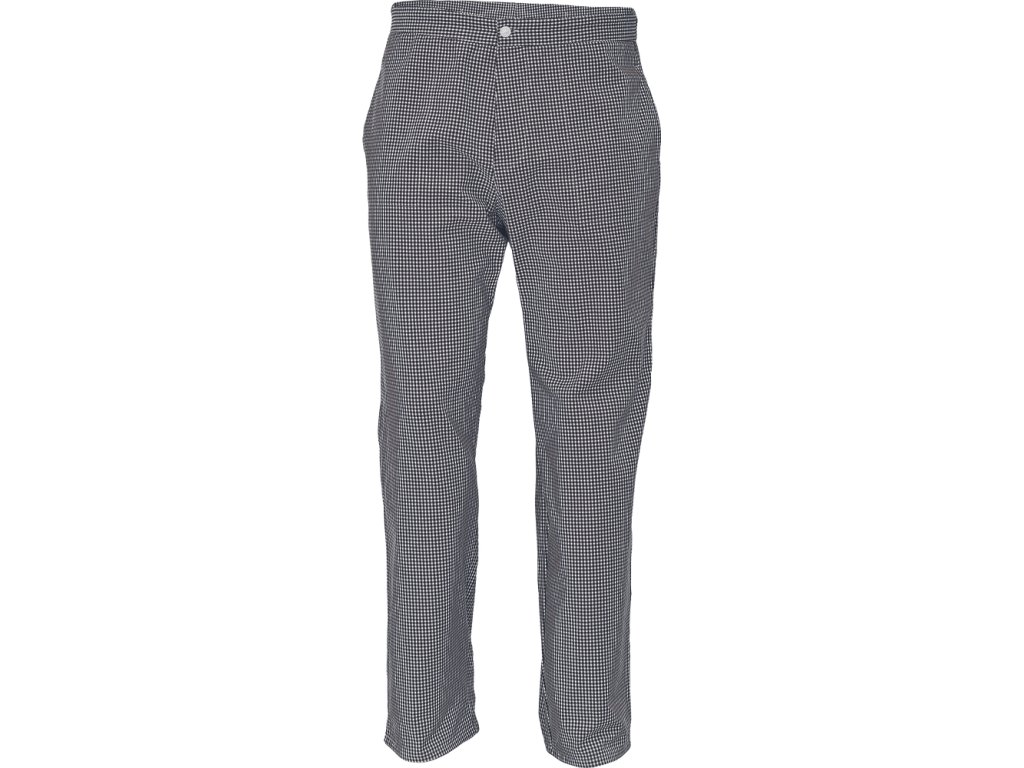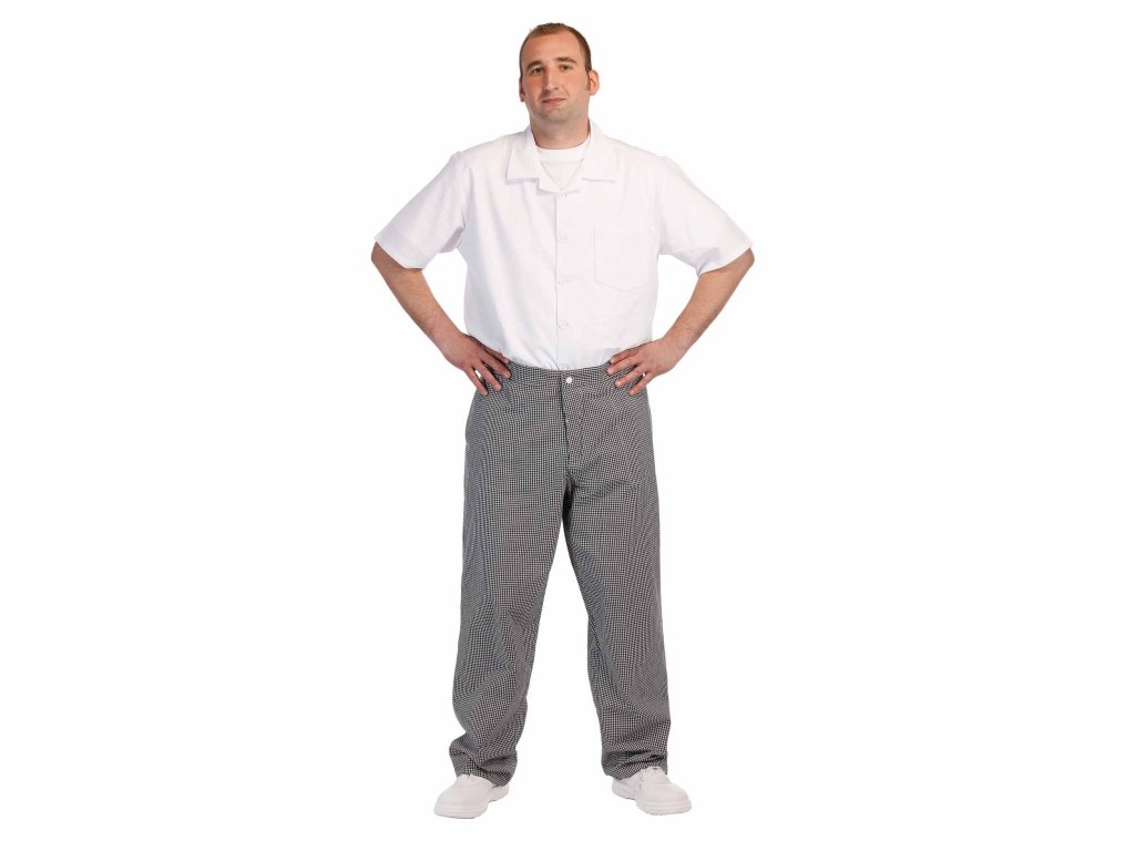 pánské bavlněné řeznické kalhoty; polohovatelný pas na knoflíky; 2 přední klínové kapsy, 1 zadní kapsa.