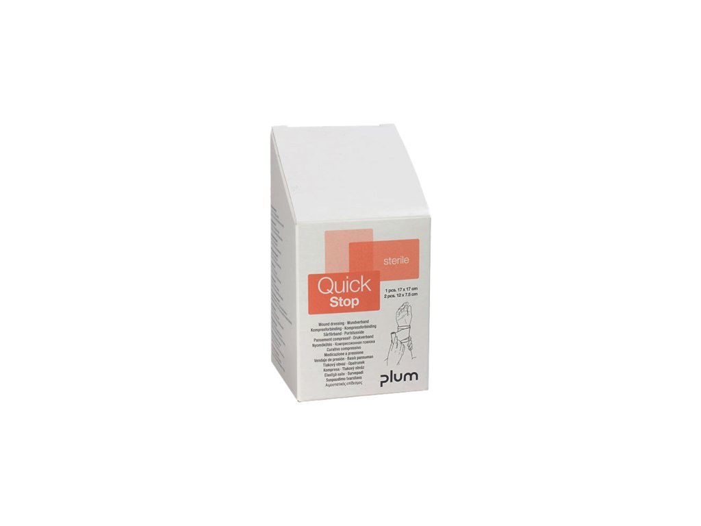 sada obvazů na rány pro účinnou první pomoc při mírném i velkém krvácení; sterilní obvaz s integrovanou kompresí; elastický, nelepivý a šetrný k pokožce; Plum QuickStop pro všeobecné použití jako tlakový, podpůrný a ochranný obvaz; sada obsahuje: 1 x obvaz na rány (17 x 17 cm); 2 x obvazy na rány (12 x 7,5 cm); lze použít samostatně a k doplňování stanic QuickSafe