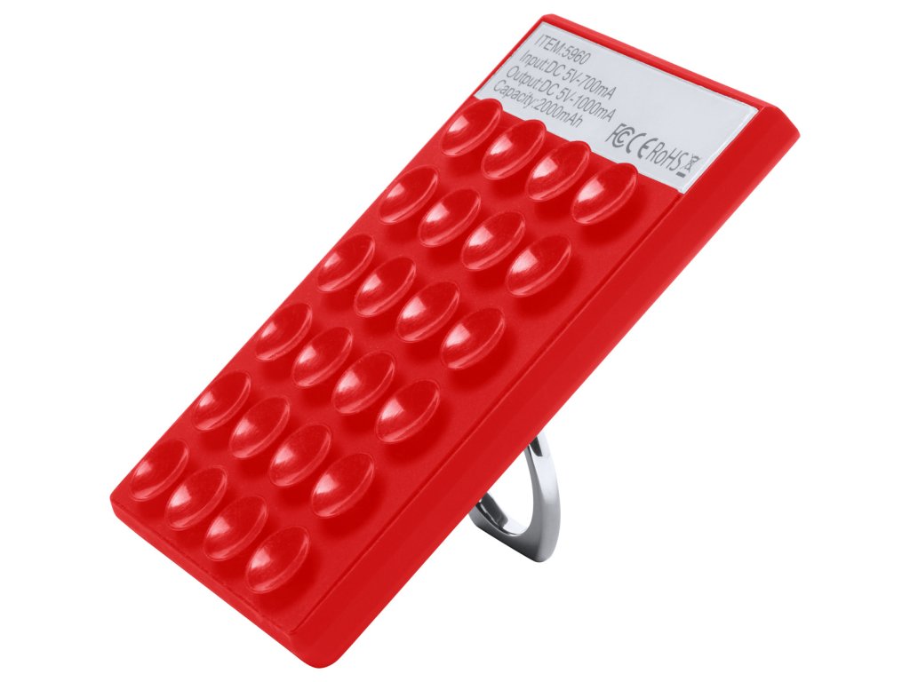 Plastová USB power banka ve tvaru kreditní karty s přísavkou, 2000 mAh baterií a s funkcí stojánku na mobil. Dodáváno bez nabíjecího kabelu.