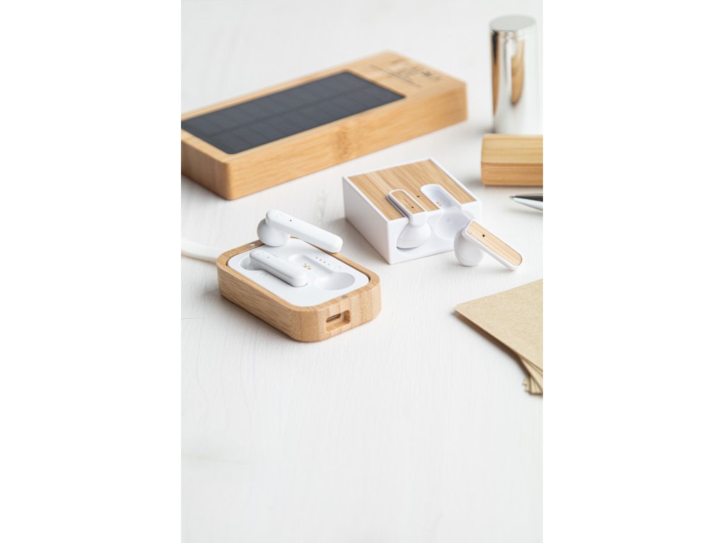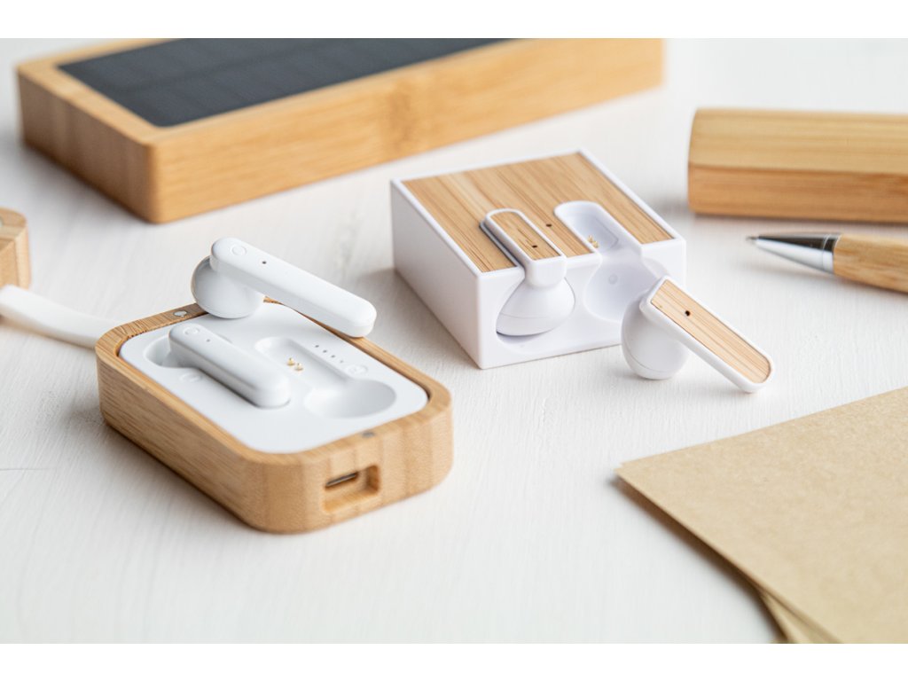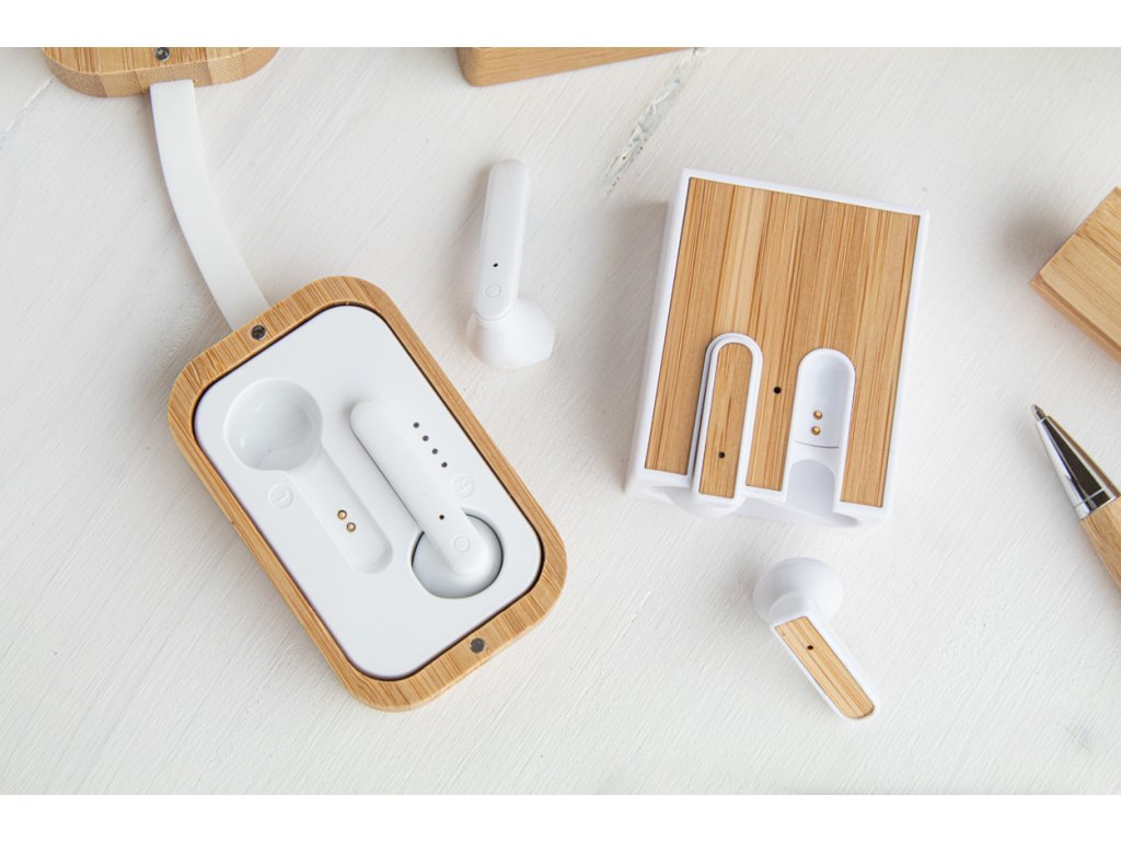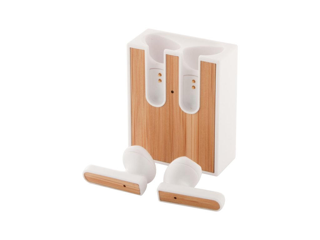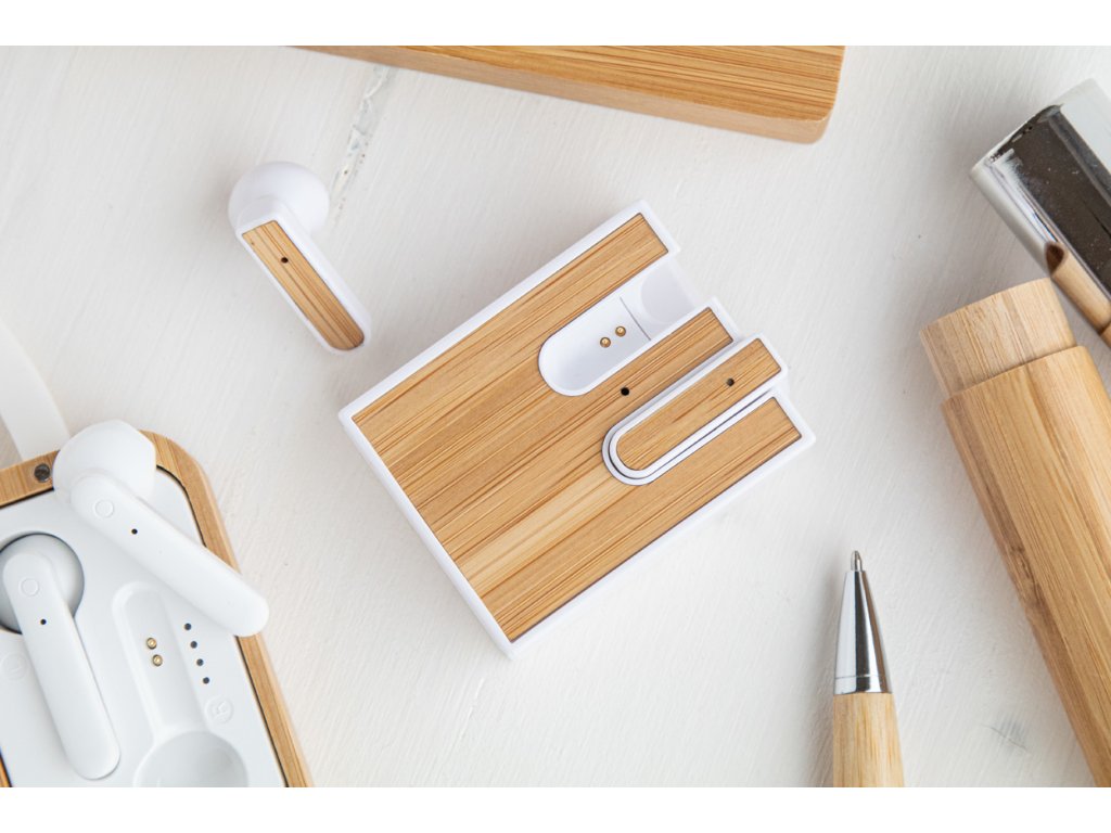 Bezdrátová bluetooth sluchátka s bambusovou vložkou a funkcí hands-free volání. V nabíječce z recyklovaného ABS plastu s bambusovou vložkou. Včetně USB nabíjecího kabelu.