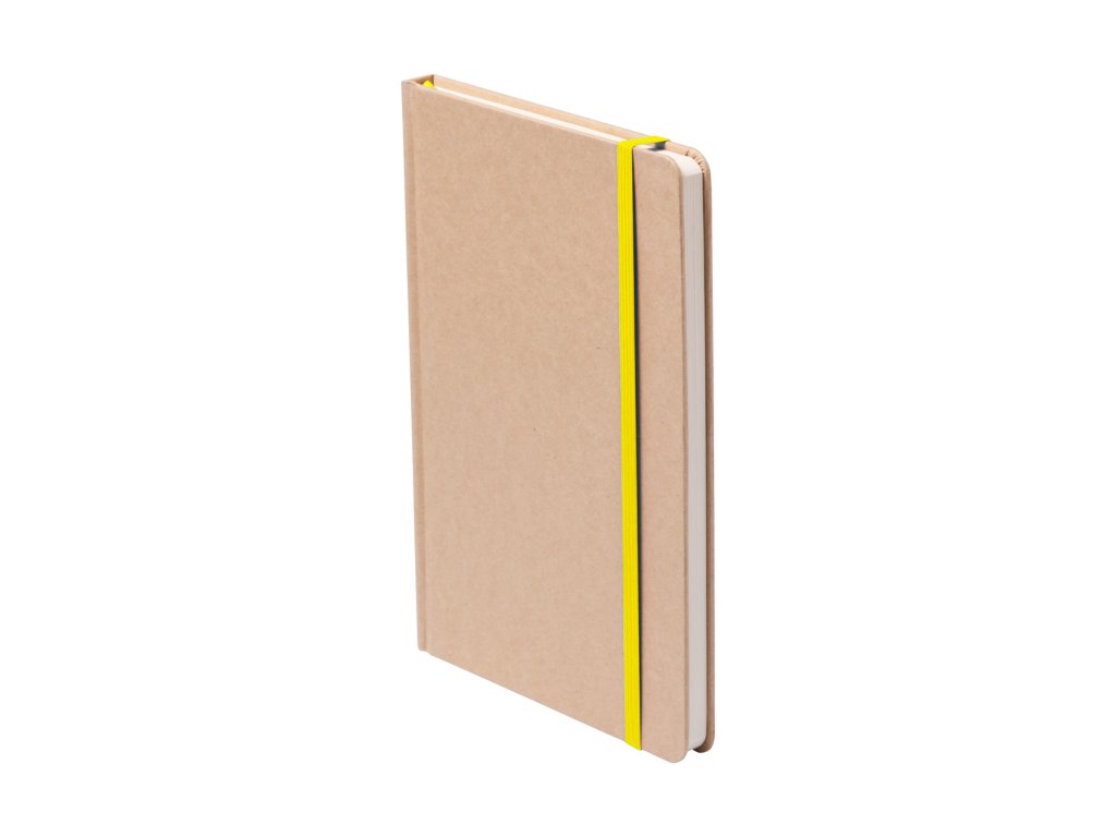 Blok s deskami potaženými recyklovaným kartonem se 100 čistými listy, barevnou záložkou a gumičkou.